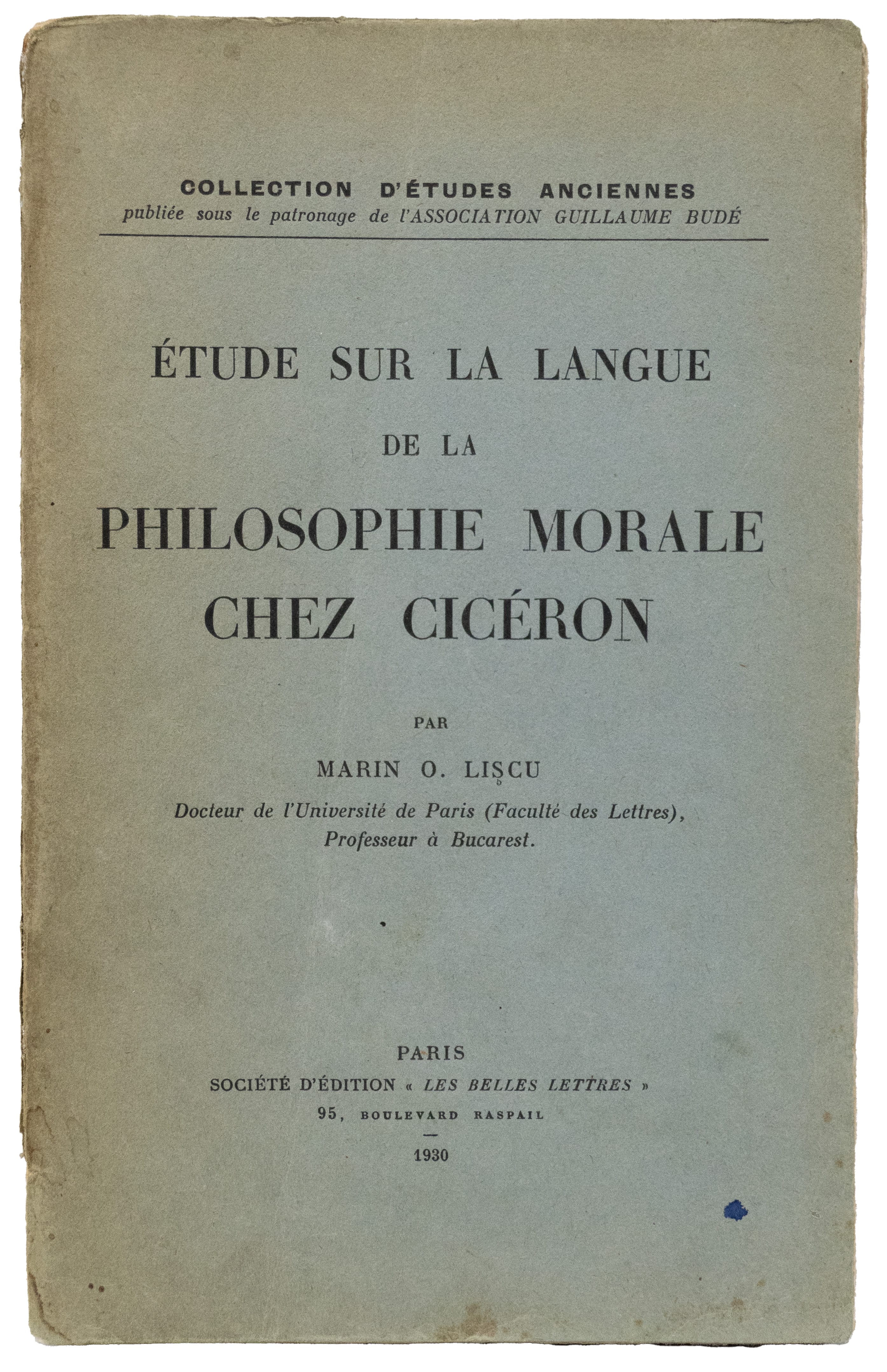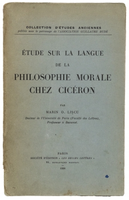 11.14 Marin O. Liscu "Etude sur la lague de la Philosophie Morale chez Ciceron", Paris, 1930, cu dedicația și autograful autorului pentru Prof. Const. Rădulescu - Motru, datată 3 iulie 1933