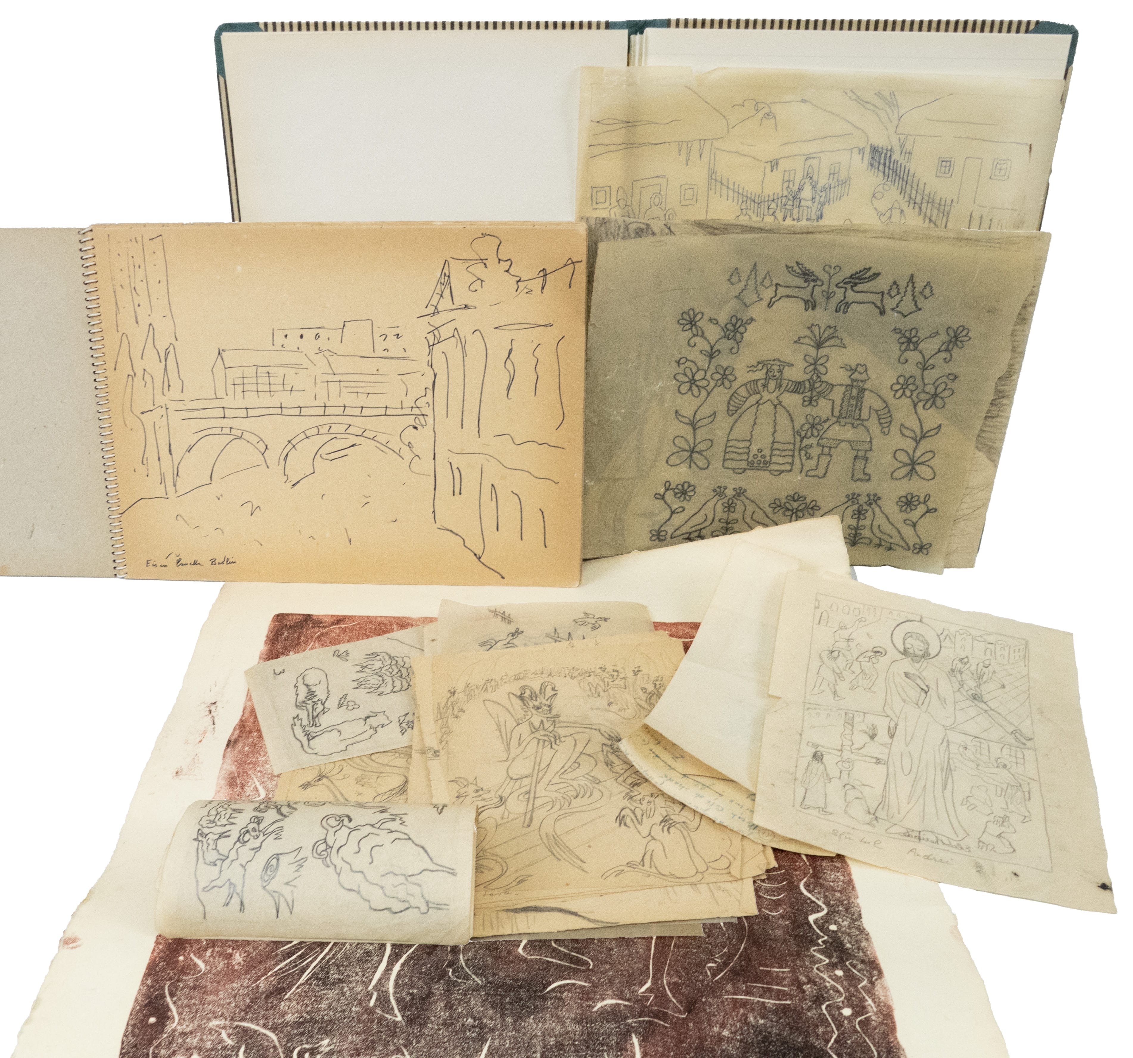 11.21 Michaela Eleutheriade: "Germania democrată", caiet de desen (22 pagini, 24x32cm); mapă cu 22 desene; litografie color pe carton subțire 41x34cm, semnată stânga jos in monogramă.