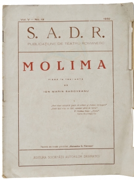 11.06 Ion Marin Sadoveanu "Molima" (piesă de teatru, jucată la Teatrul Ventura în 5 dec. 1930), cu dedicația și semnătura dramaturgului pentru Hurmuz Aznavorian, datată 932, 15 Dec.