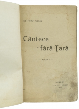 11.08 Octavian Goga "Cântece fără Țară" Ediția Ia, Editura C. Sfetea, București, 1916 (ștampilă cu semnătura autorului pe pagina de gardă)