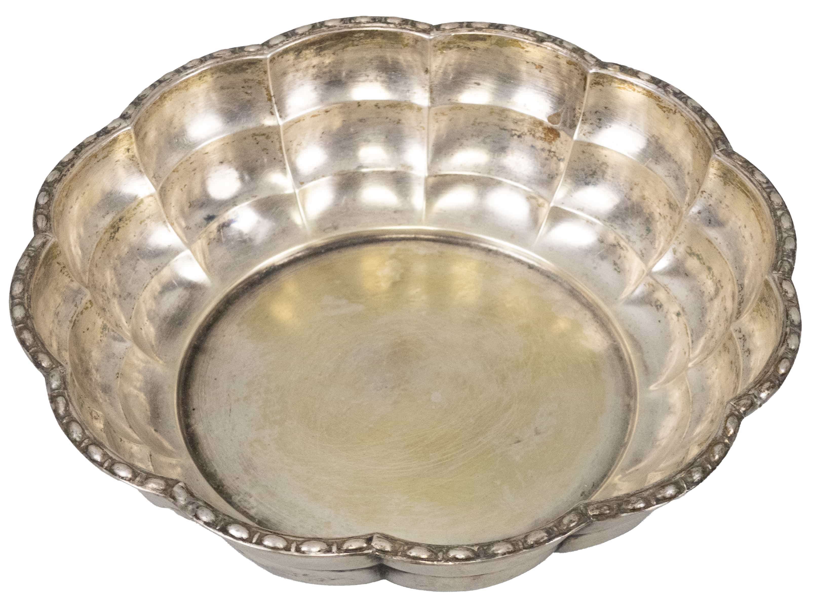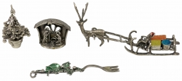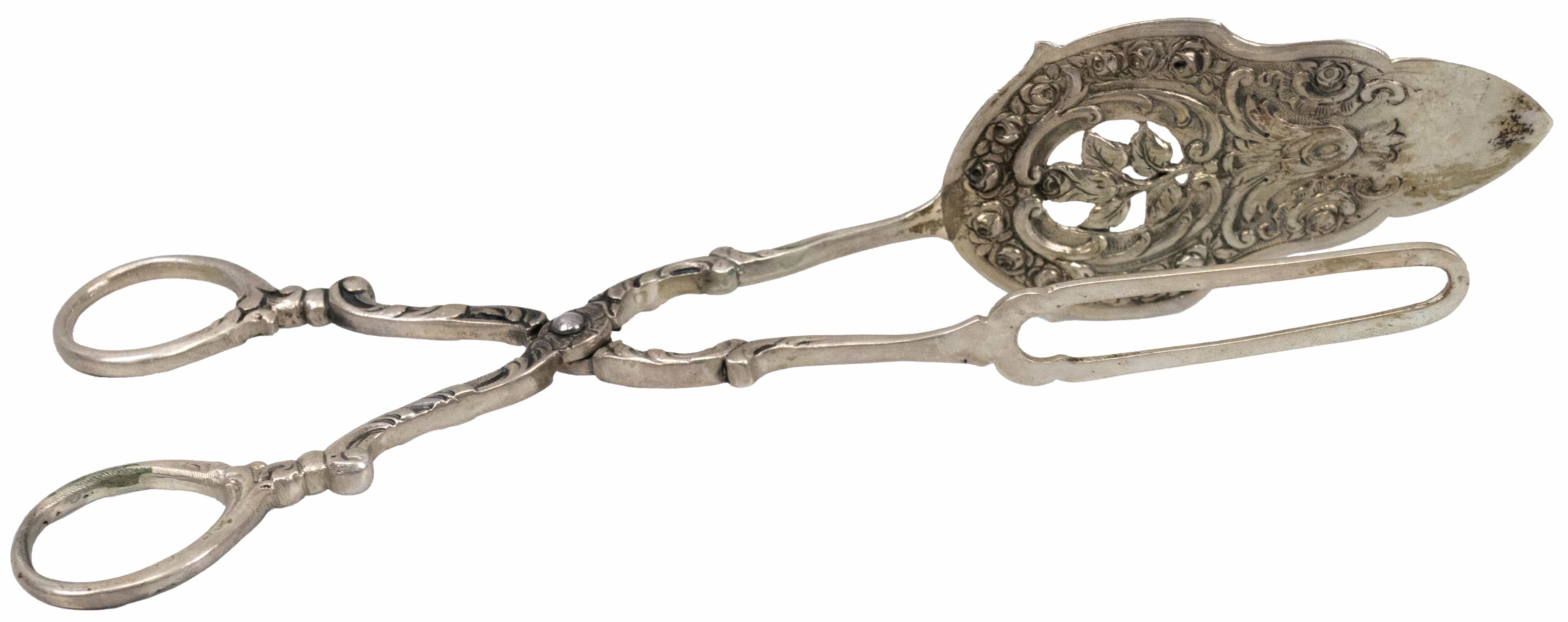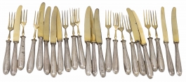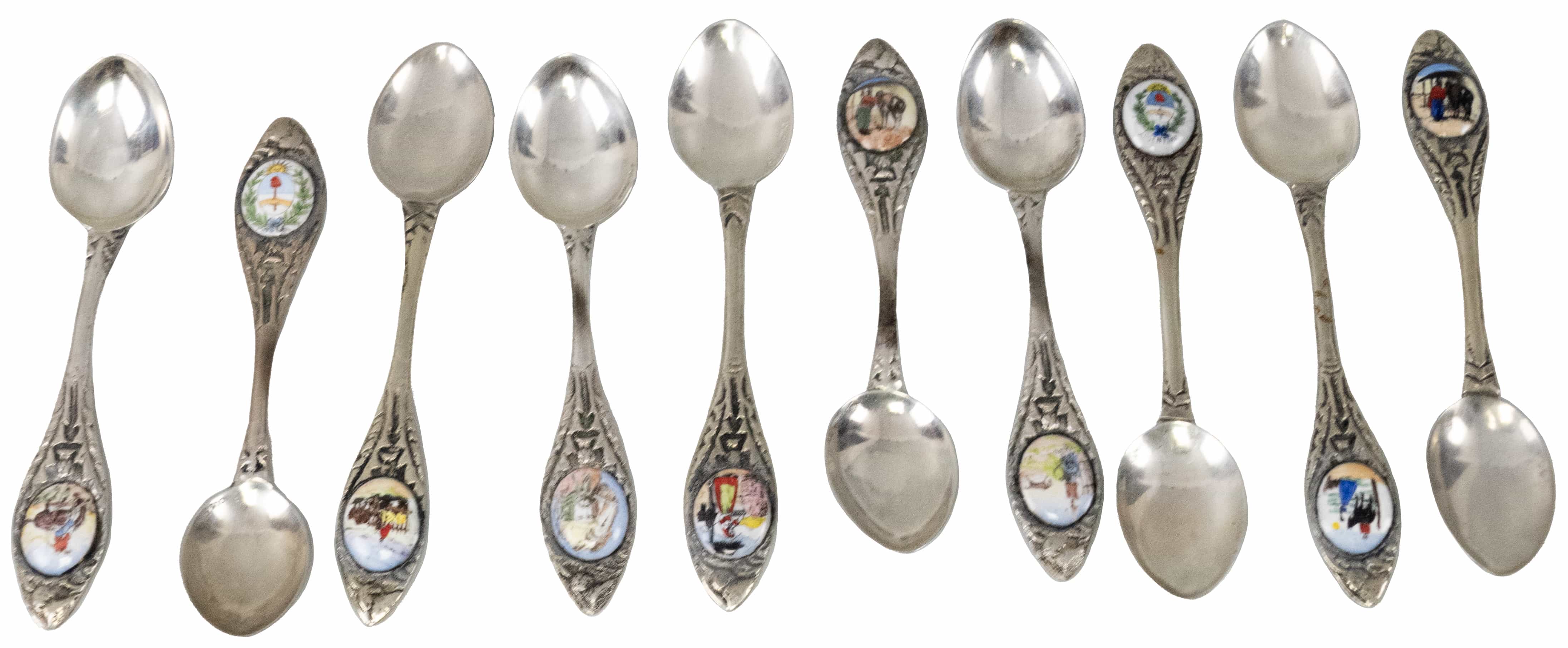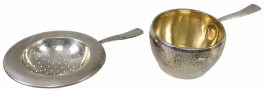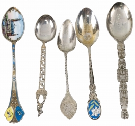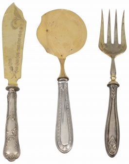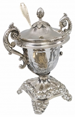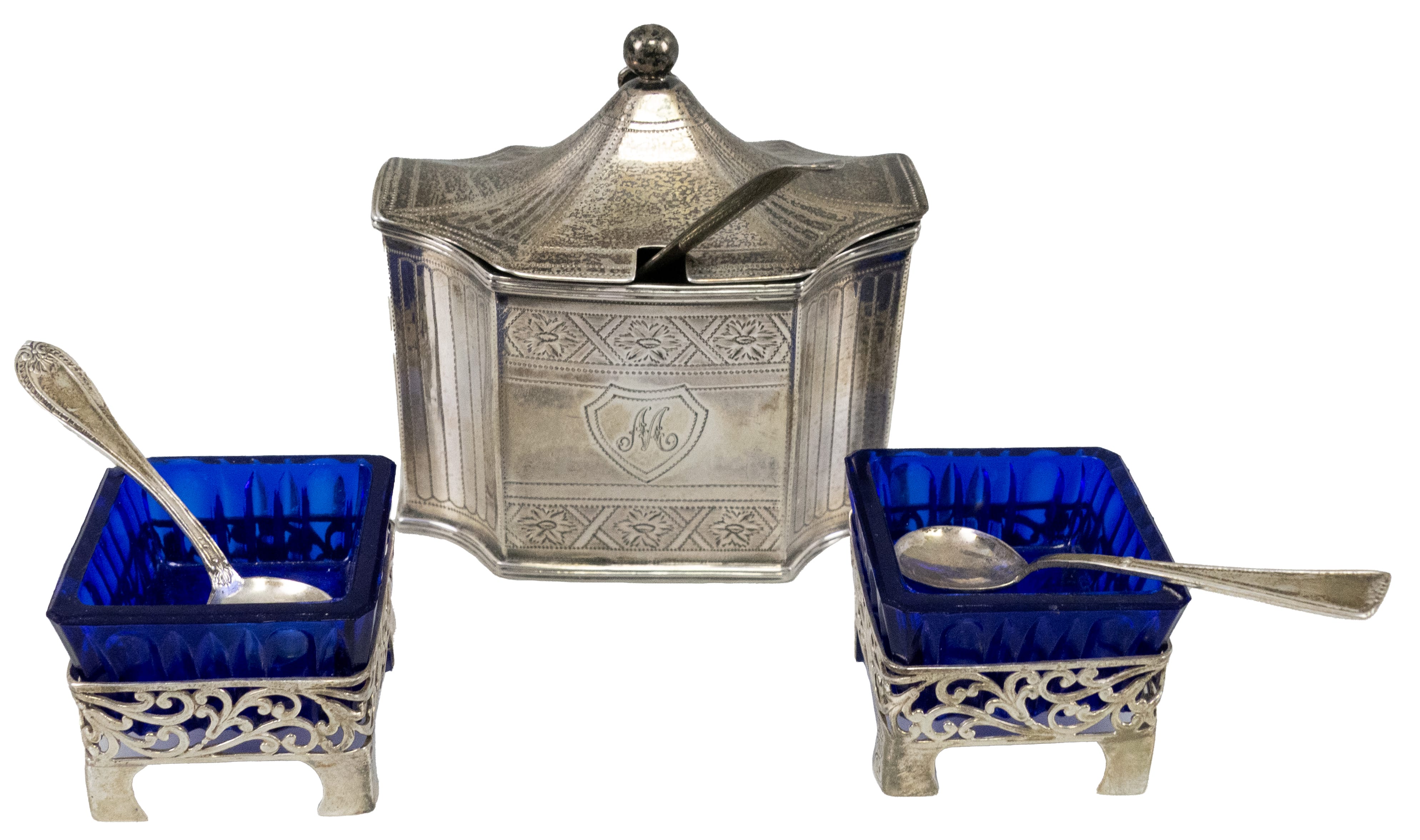 04.39 Vas pentru muștar, două solnițe și trei lingurițe, argint 925 și 800 marcat, traforat, gravat, monogramă M, trei recipente din cristal și sticlă, lingurițe L 11/7.2/7cm, vas muștar 8.5x8.5cm, solniță 4x3.5cm, brut 154.78g, Italia, Anglia, mici defecte |
