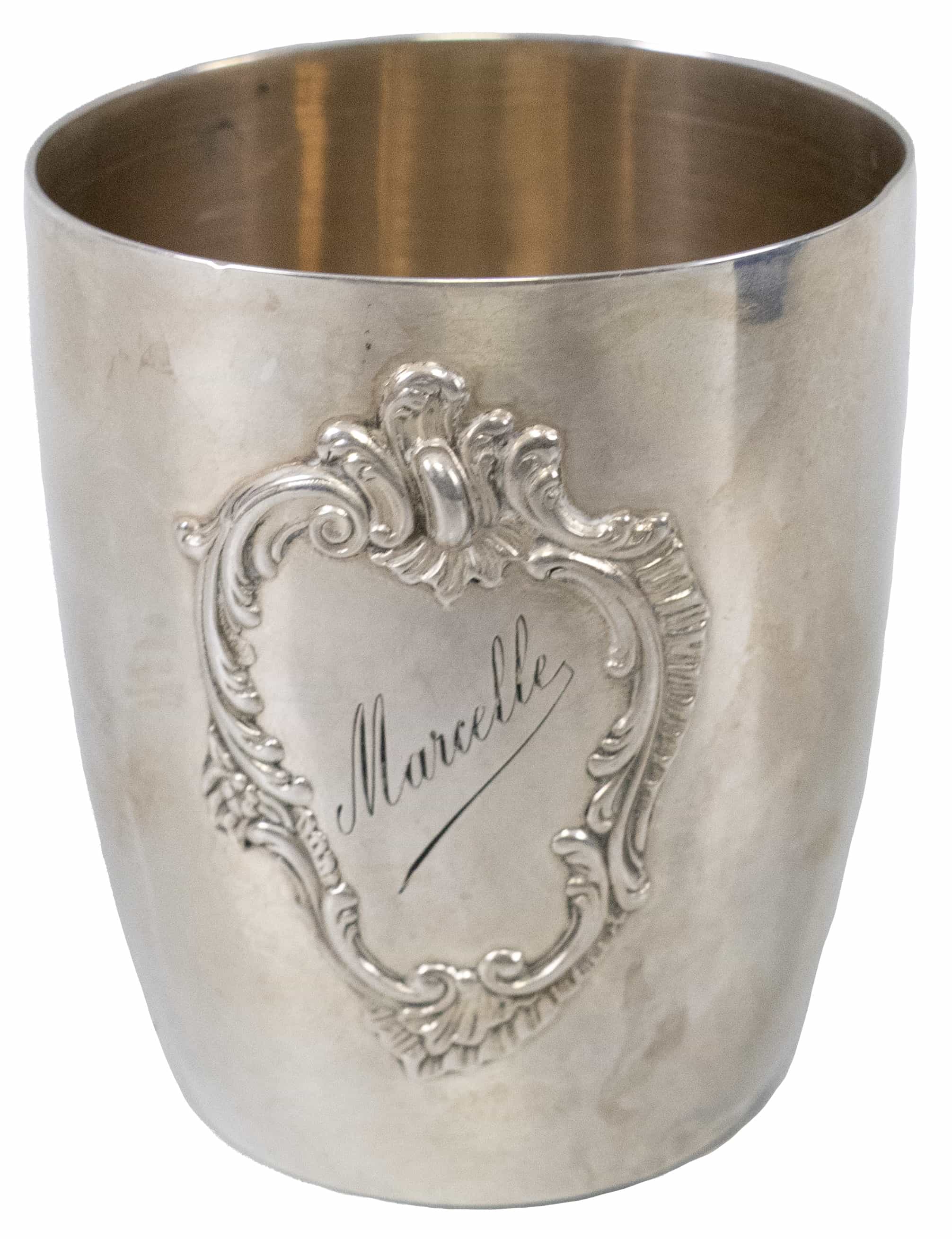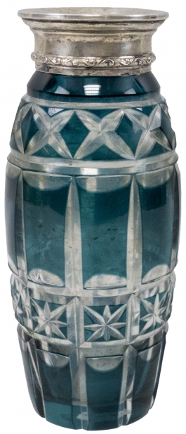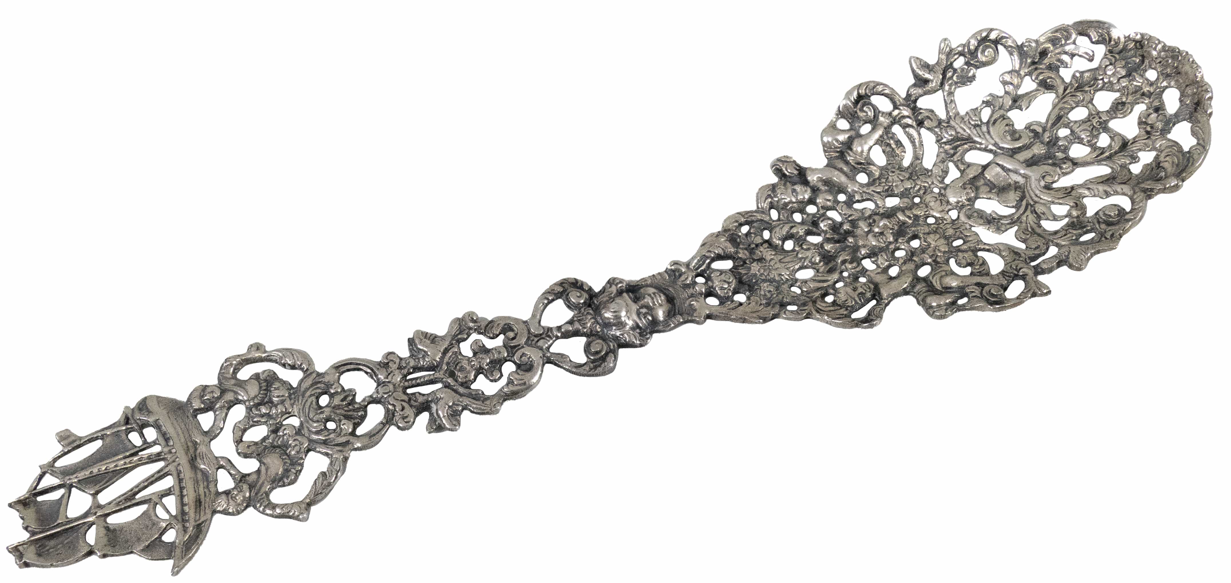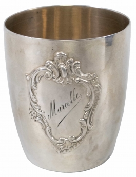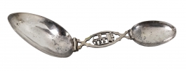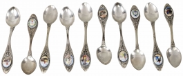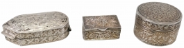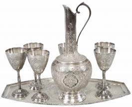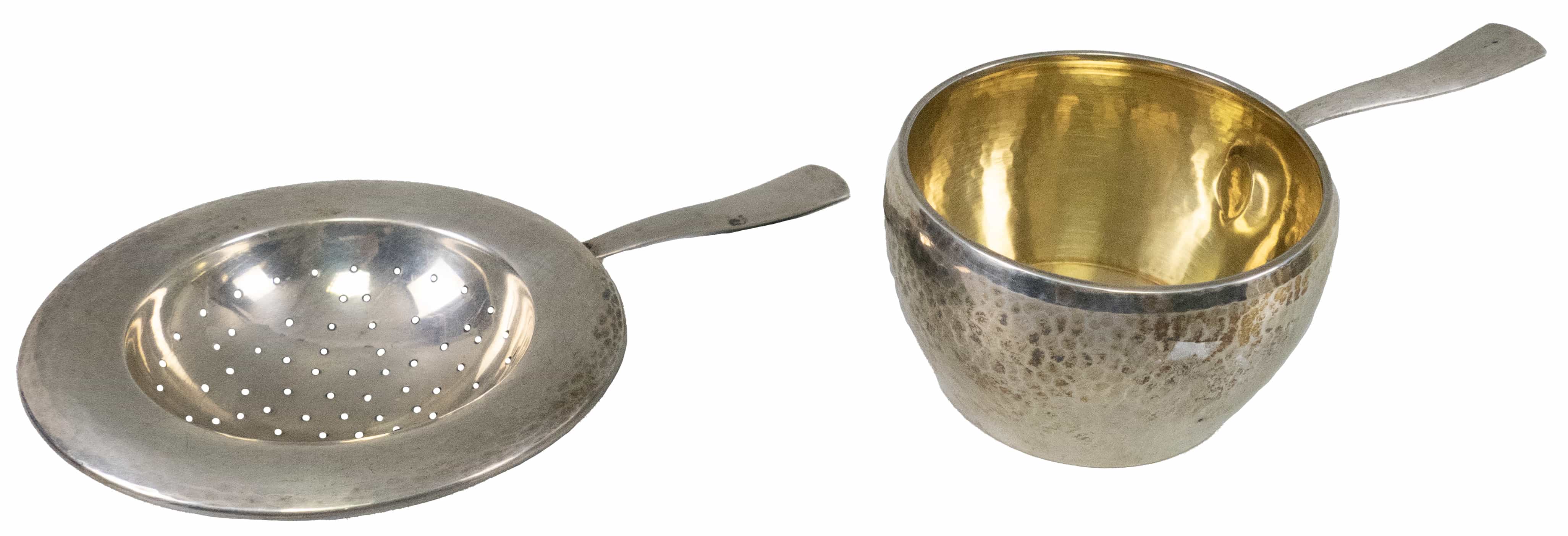 04.39 Vas pentru muștar, două solnițe și trei lingurițe, argint 925 și 800 marcat, traforat, gravat, monogramă M, trei recipente din cristal și sticlă, lingurițe L 11/7.2/7cm, vas muștar 8.5x8.5cm, solniță 4x3.5cm, brut 154.78g, Italia, Anglia, mici defecte |