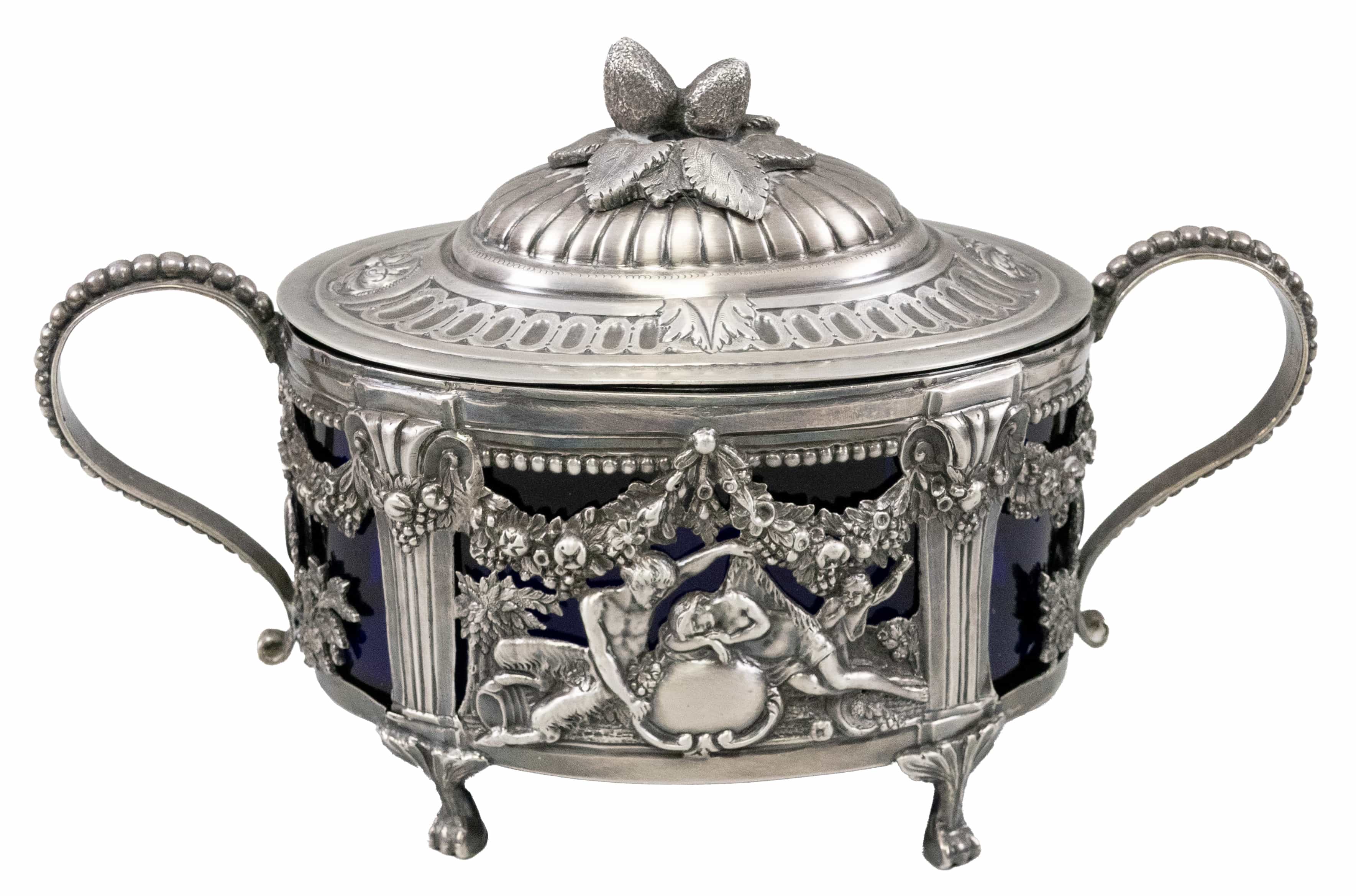 04.01 Zaharniță cu anse și capac, pe patru piciorușe, argint 800 marcat, recipient din cristal albastru cobalt, detașabil, cca.21x10cm, 297.20g, Franța Paillard Freres 1868/1888, mici defecte