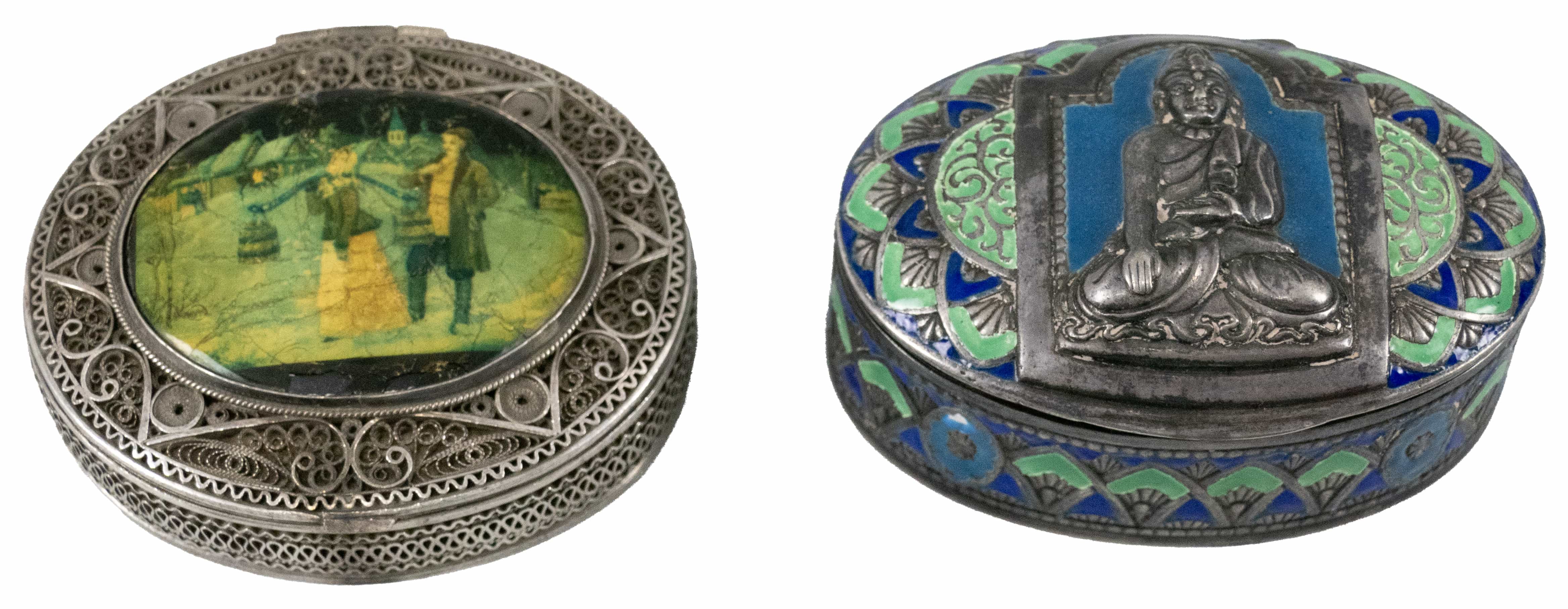 04.11 Două casete, mici dimensiuni, argint 900 și 800, tehnică filigran manual, decor oriental, email, aurire parțială, 6.5x4.5/6.3x5.7cm, brut 96.54g, ateliere europene, sec.XX, mici defecte