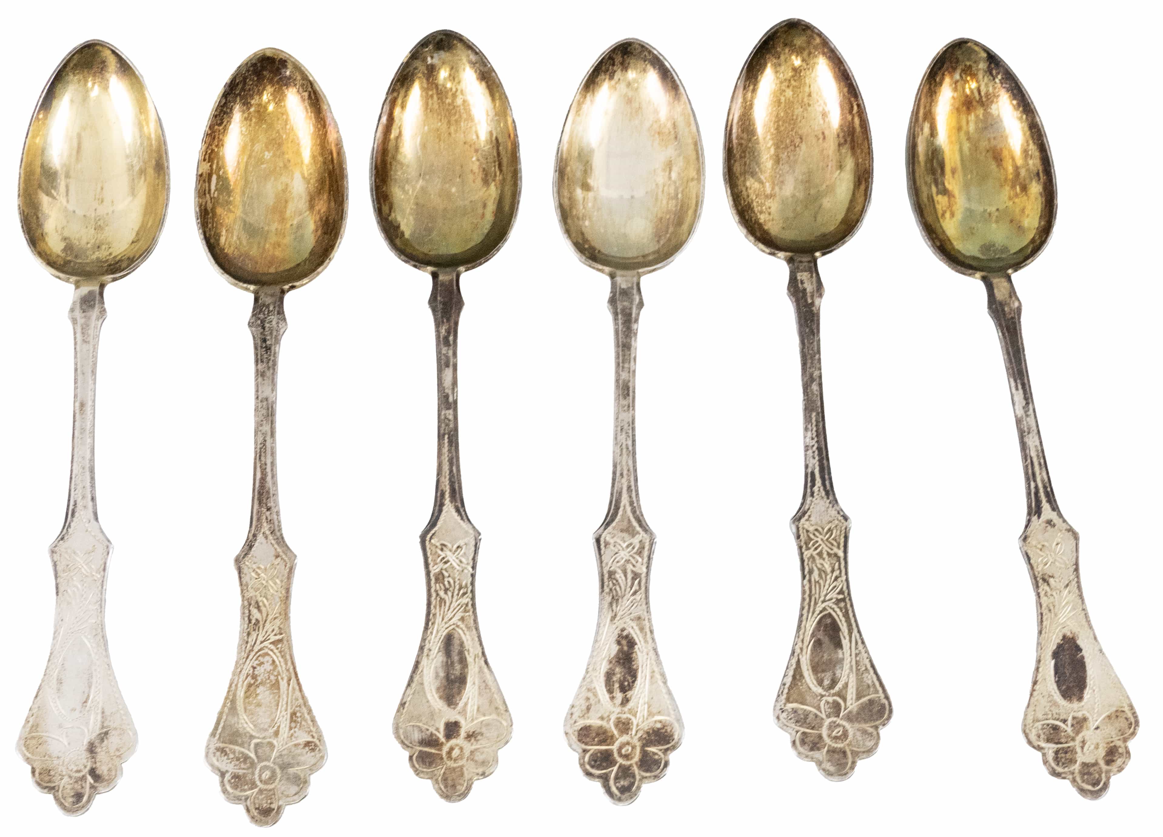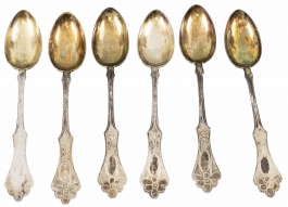 04.12 Șase lingurițe, argint 750 marcat, cozi cu model lobat, gravură manuală, aurire parțială, L 15.5cm, brut 156.11g, poanson românesc 1926/1937