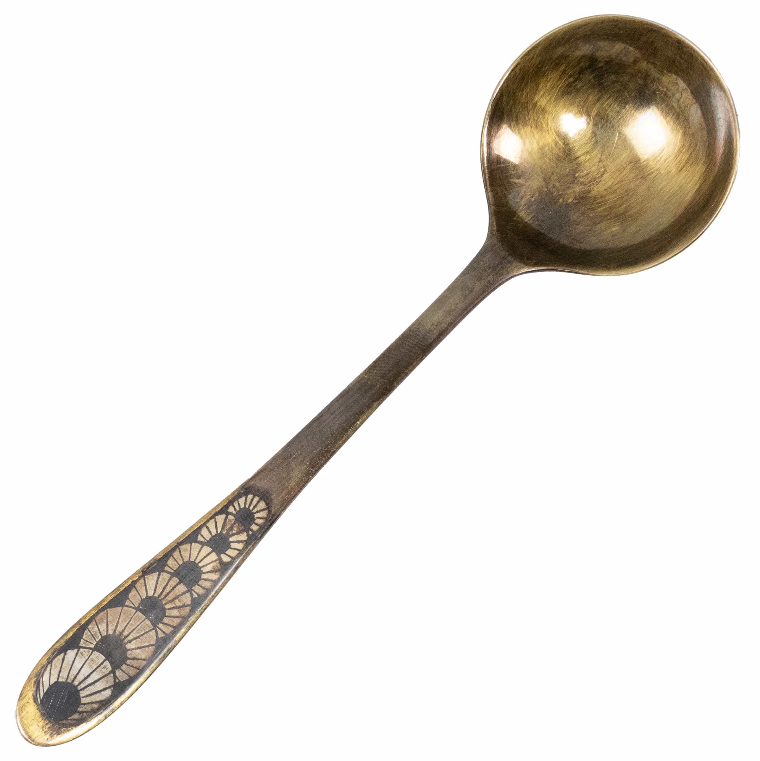 04.14 Lingură pentru servit, argint 875 marcat, aurire parțială, pictată cu email negru (manieră Niello), L 15.5cm, 38.48g, Rusia cca.1960, în casetă, mică uzură