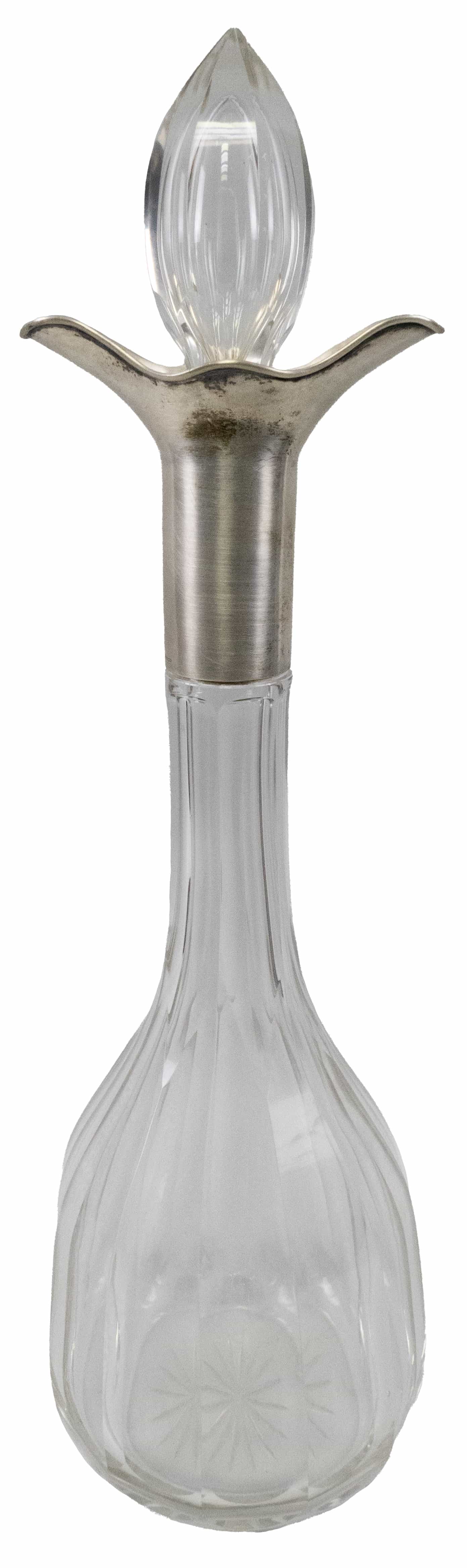 04.16 Flacon cu dop, cristal șlefuit, gravat, argint 800 marcat, H 39.5cm, atelier european, poanson în clar M.Bosco, mici defecte