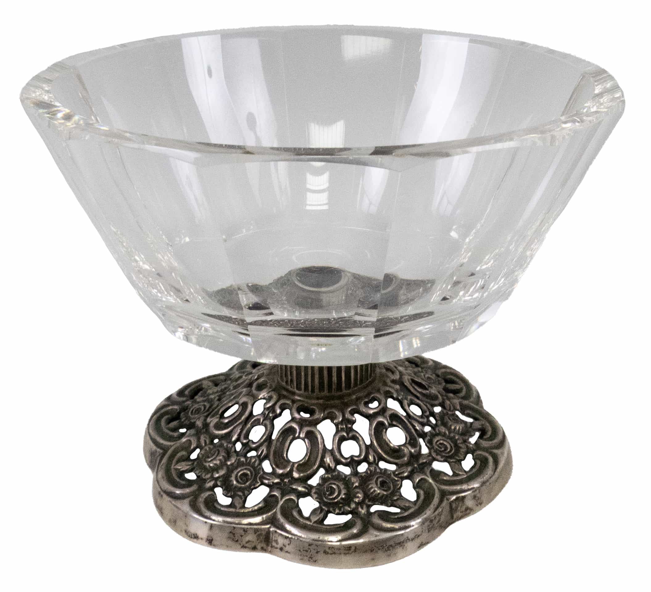 04.20 Bombonieră pe picior, cristal fațetat, gravat și argint 835 marcat, decor perforat, H 8.5cm, dia.11,7cm, Germania(?), prima jum.sec.XX