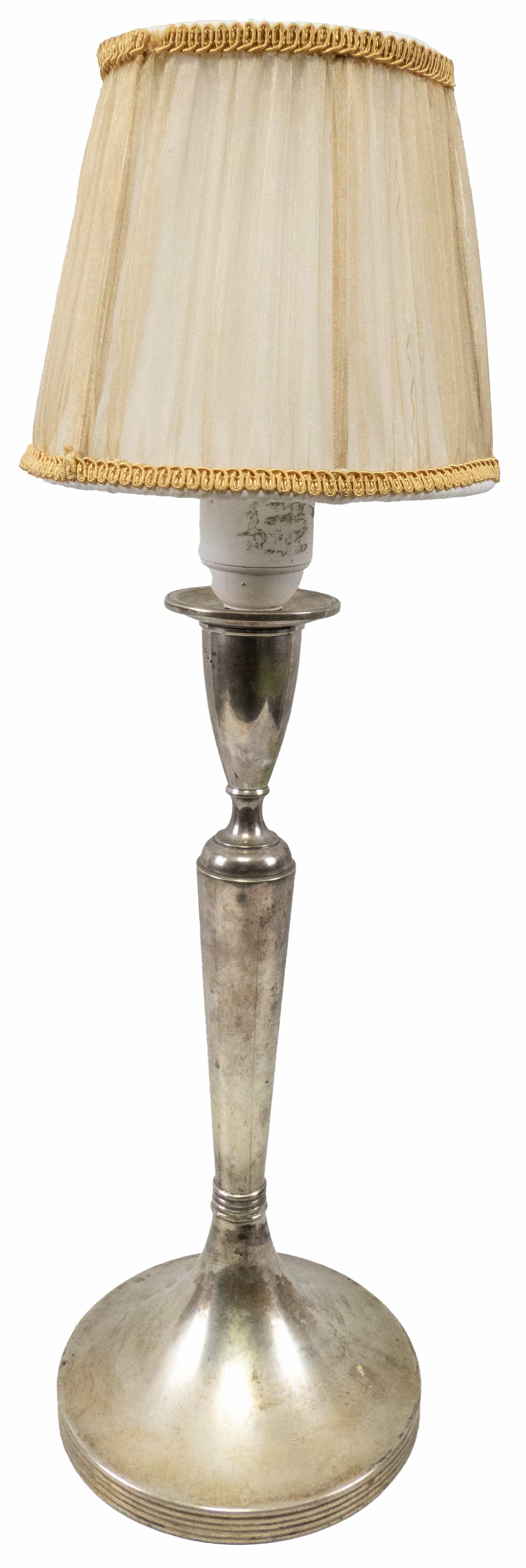 04.23 Lampă de masă, pe picior, argint 800 marcat. abajur din mătase, adaptată pentru electricitate, elemente metal comun, H 48cm, brut 470g, Cehoslovacia 1921/1928, mici defecte