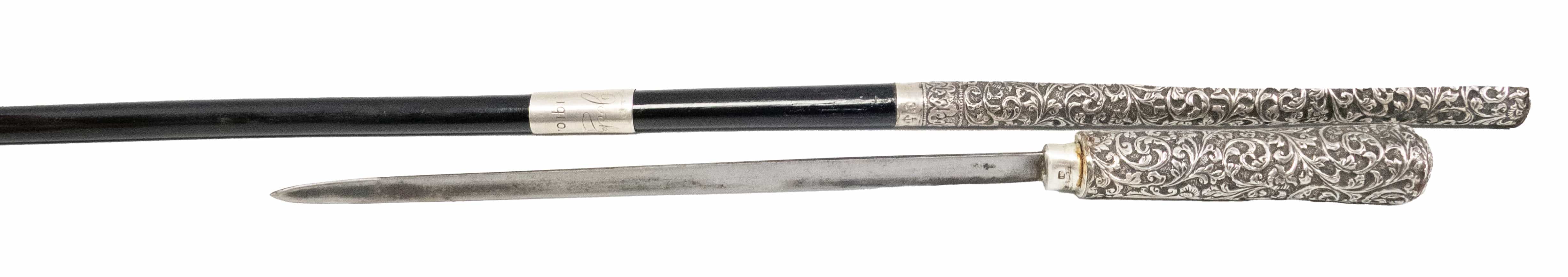 04.25 Baston cu stilet, elemente separate asamblate, argint 875 marcat (manșon) și argint 800 testat, gravat, cizelat, lamă stilet și bază metal comun, manșon cu poanson Rusia sec.XIX (adaptat), corp piesă posibil Germania sec.XIX, mici defecte