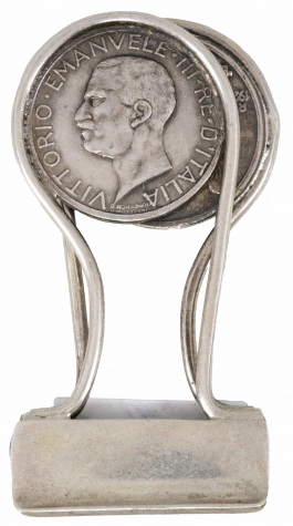 04.10 Clips bancnote, argint 800 marcat, decor cu monede 5 lire VITTORIO EMANUEL III, L 6cm, 18.74g, Italia, sec.XX, ușoare deformări
