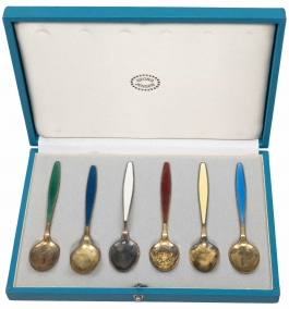 04.13 Șase lingurițe model Mocca, argint 925 marcat, aurit, email policrom translucid, pe fond cu aspect sablat, L 9.5cm, brut 57.68g, poanson în clar Georg Jensen Sterling Denmark, în casetă originală, marcată, necesită curățare