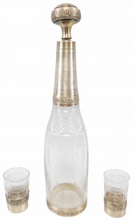 04.19 Flacon cu dop și două păhărele, cristal gravat și argint 950 marcat, flacon H 26cm, pahare H 5cm, dia.3,5cm, Franța, prima jum.sec.XX, mici defecte