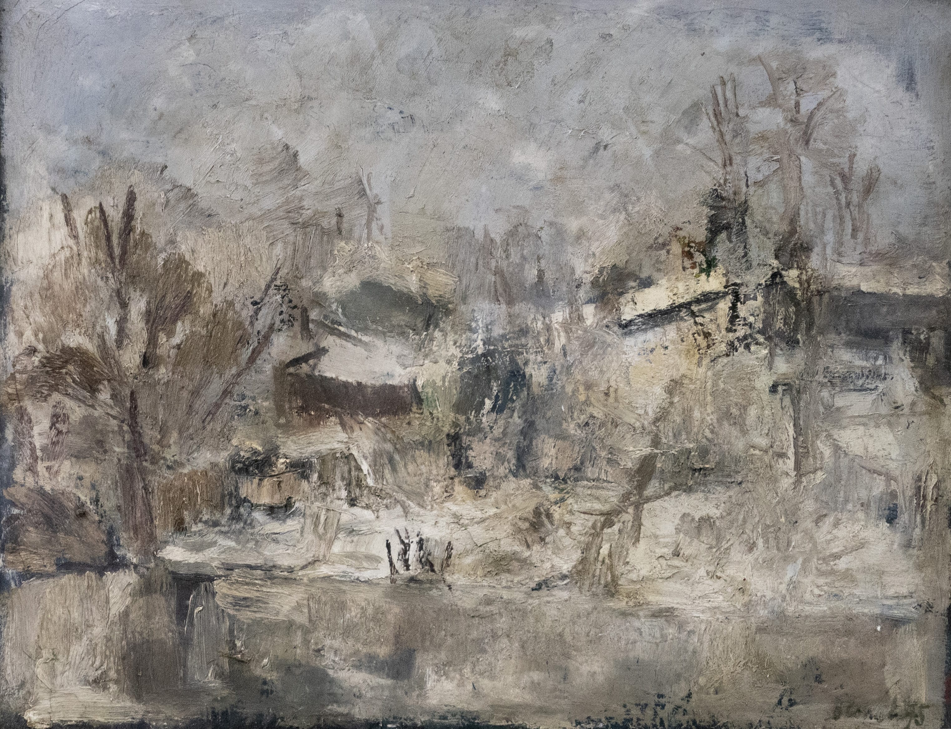 06.05 Dan Constantinescu (n.1950) - "Peisaj de iarnă - Plumbuita", ulei pe pânză, 35x45cm, semnat dreapta jos cu negru, datat (19)75