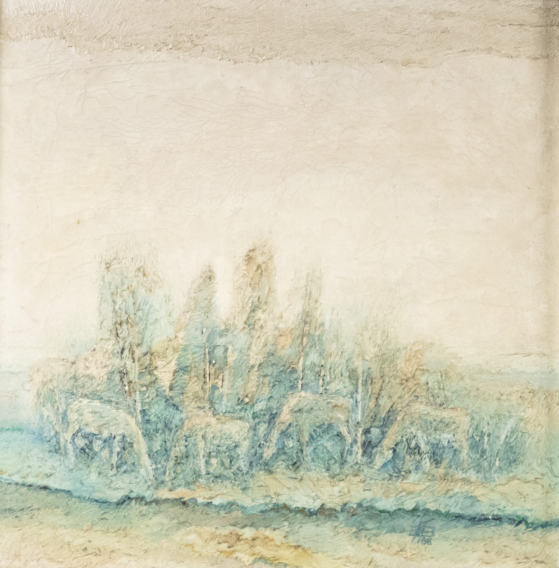 06.07 Mihai Bandac (n.1939) - "Cai în crâng", ulei pe pânză, 65.5x65cm, semnat dreapta jos în monogramă, datat (19)86