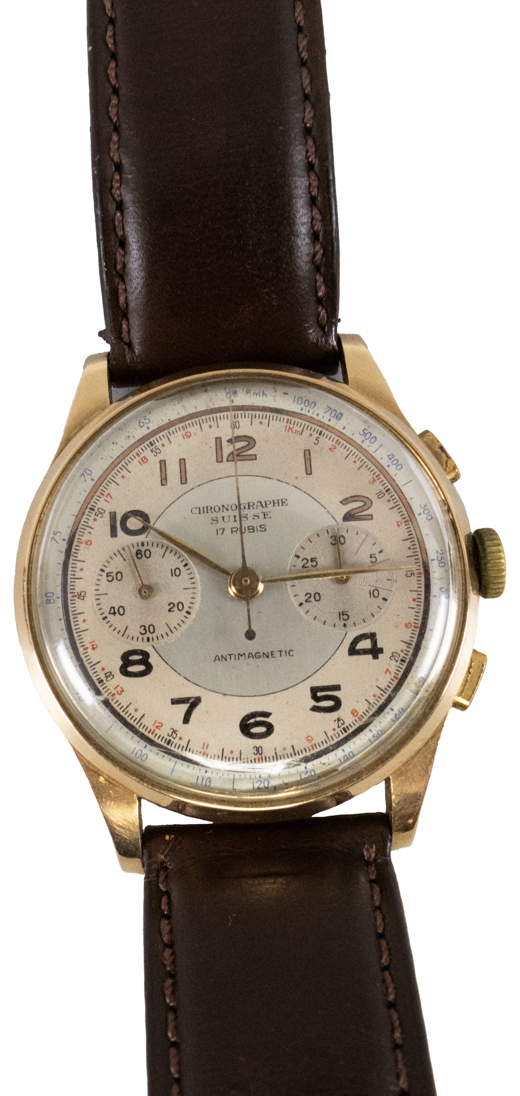 03.01 Ceas de mână Cronographe Suisse, la 30 minute, balans compensat, spiral plat, 17 rubine, carcasă și capac, aur 18K marcat, sec.XX, în stare de funcționare