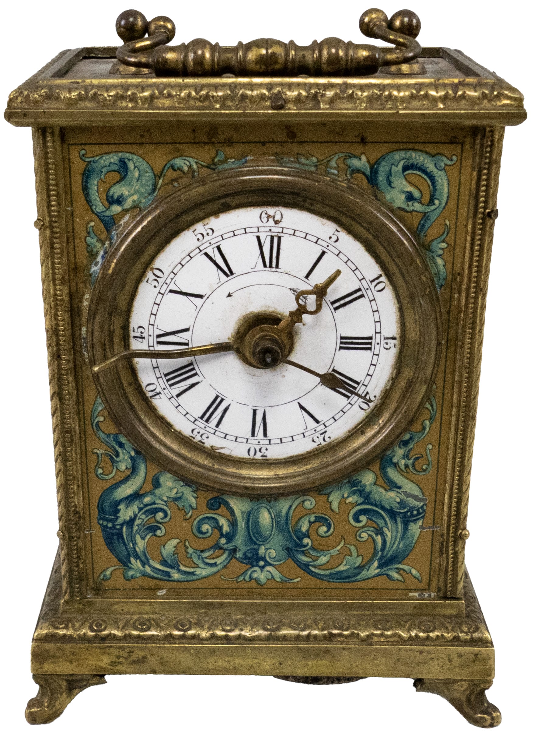 03.02 Ceas de voiaj, cu sonerie, mecanism pe sistem de funcționare cu pendul, cadran email, carcasă alamă, elemente rococo venețian, 1910-1915, necesită revizie