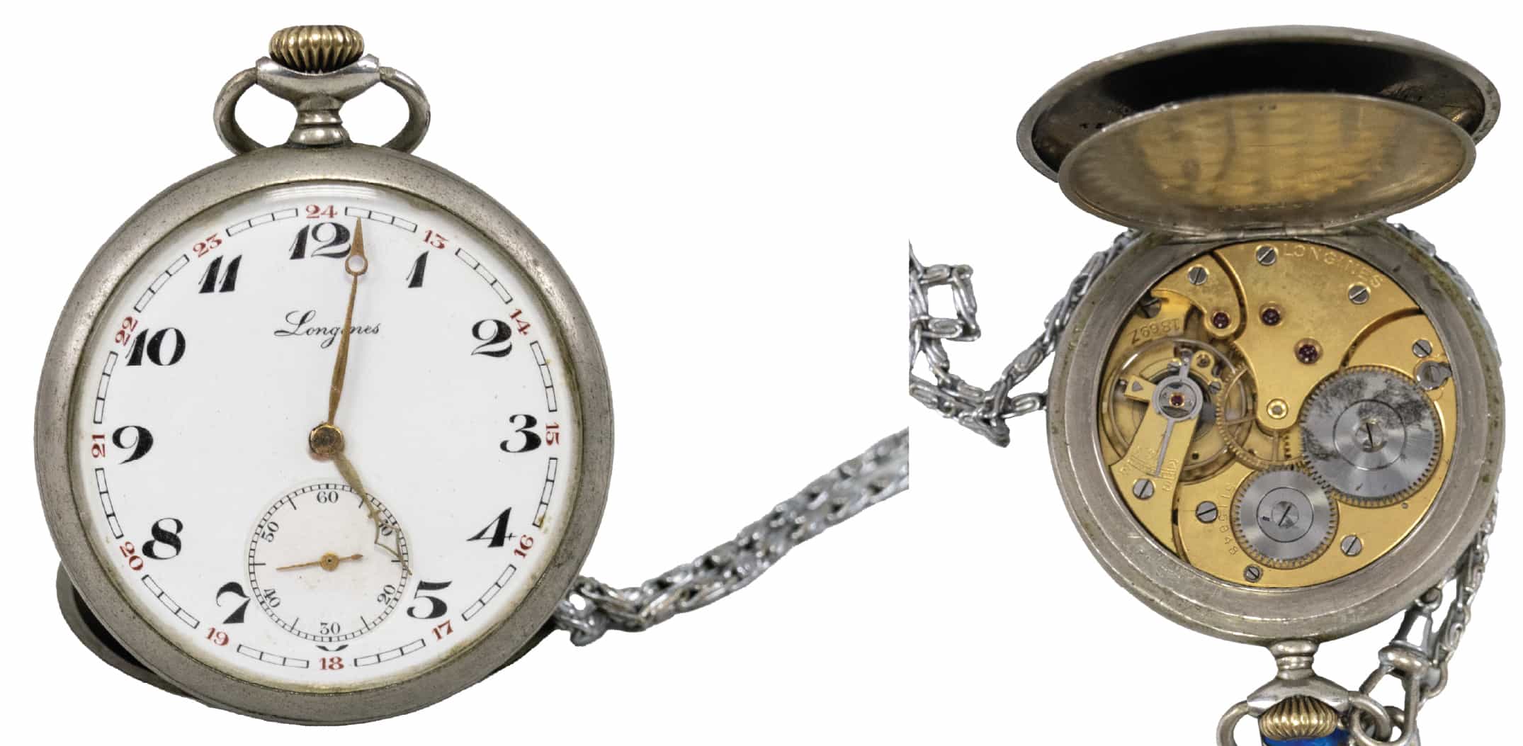 03.01 Ceas de buzunar Longines, cadran email, balans compensat, carcasă metal, medaliat Grand Prix, lanț metal, calibru 18.69Z, serie mecanism 5115848, 1929/1934, stare de funcționare