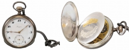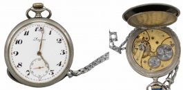 03.02 Ceas de buzunar Longines, cadran email, balans compensat, spiral Breguet, calibru 19.75N, medaliat Grand Prix, serie 4753516, lanț argint 835 marcat, carcasă și capac argint 800 marcat, 1928/1929, stare de funcționare