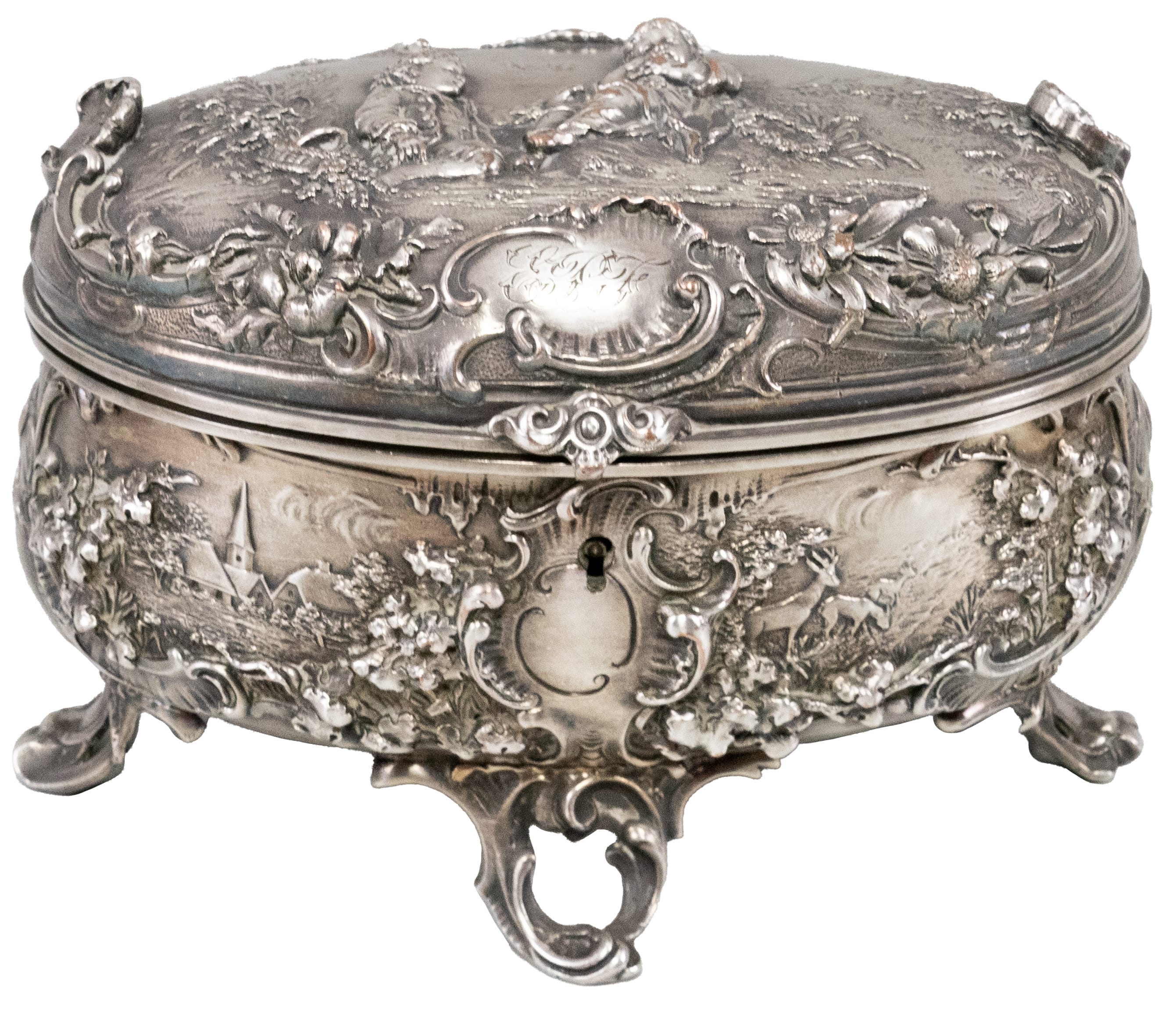 01.03 Casetă ovală pentru bijuterii, patru picioare, mecanism pentru cheie, interior capitonat, metal decorat în relief cu personaje, animale, case, marcată, stil Baroc, 16.5x12x11.5cm, înc.sec.XX