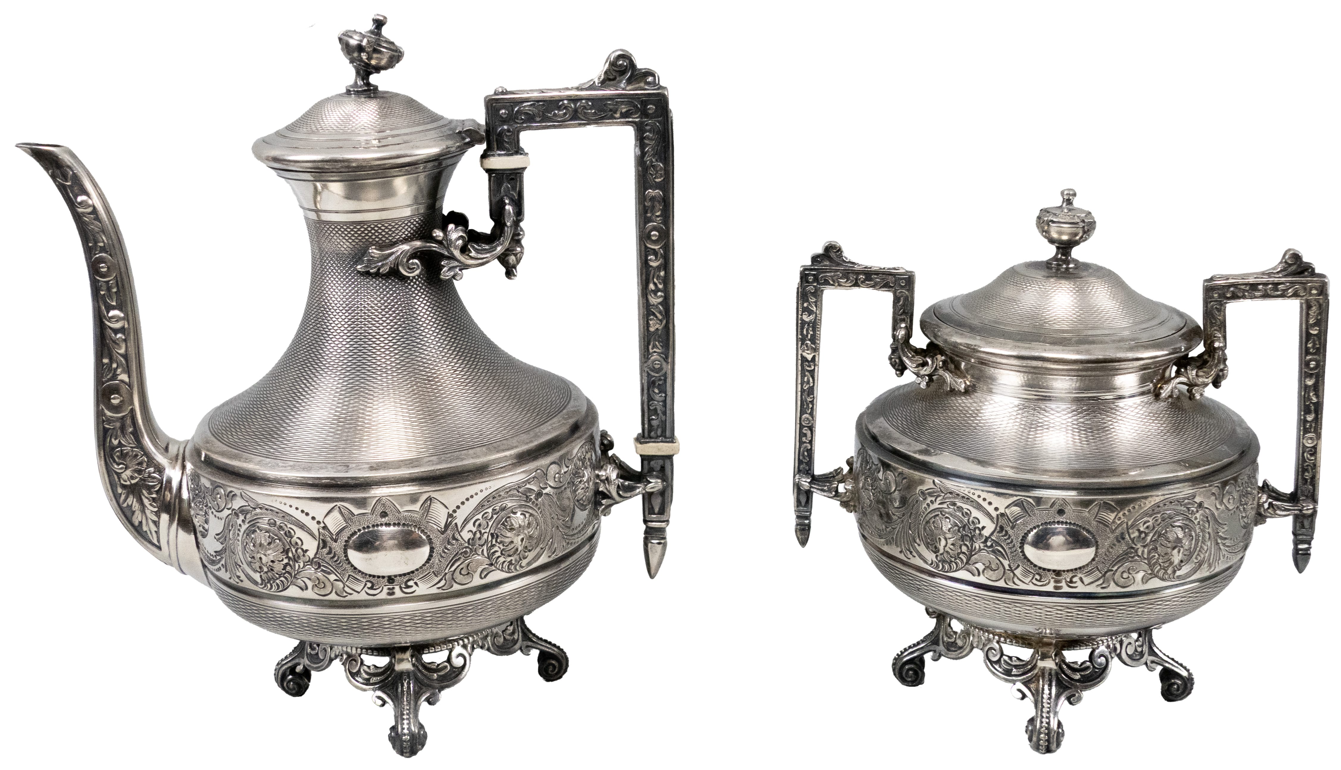 01.06 Ceainic și zaharniță, metal placat cu argint, decorat în relief, aurite la interior, marcate, Anglia (?), perioada interbelică