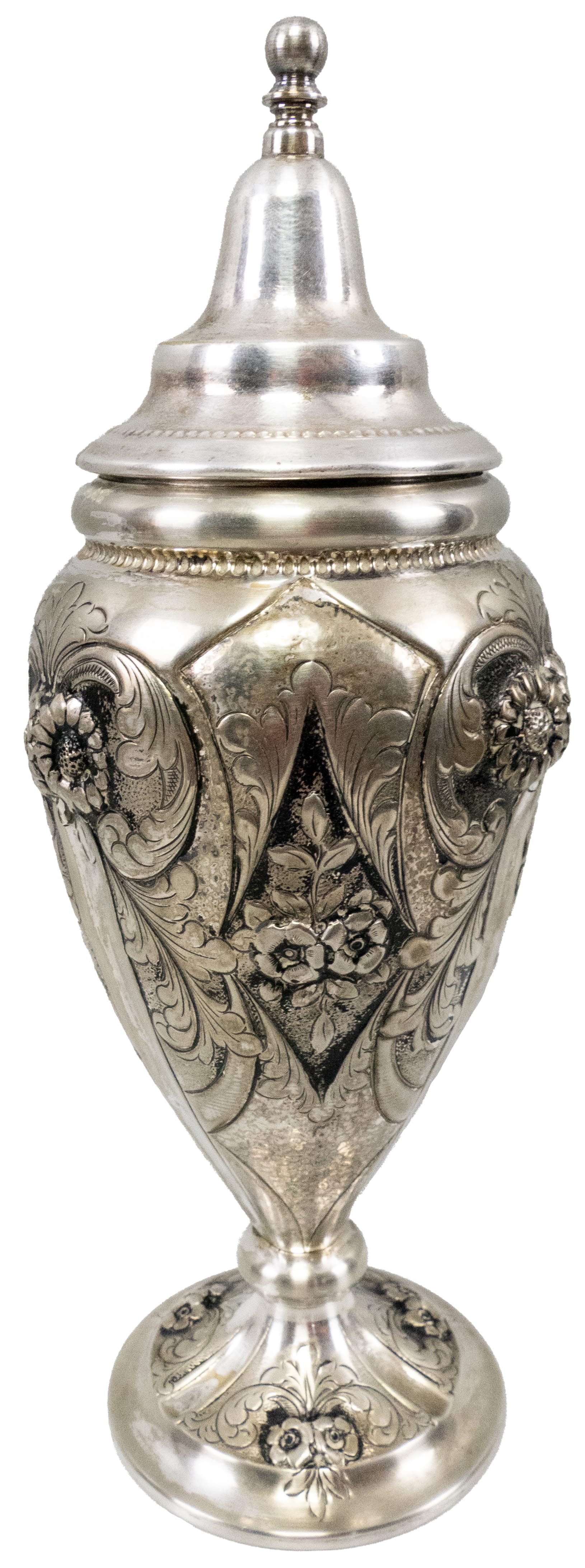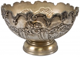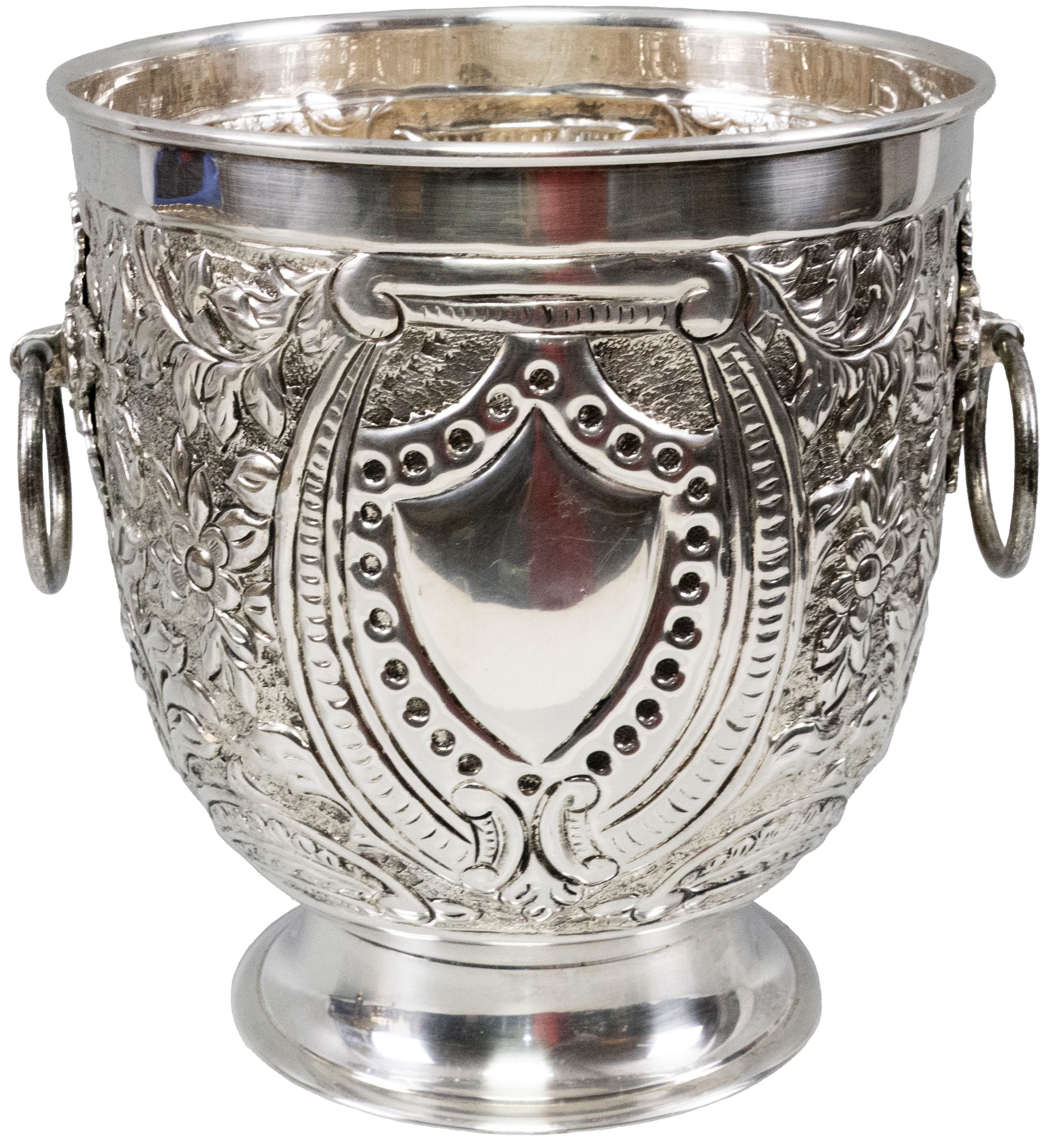 01.09 Frapieră cu anse, metal argintat, decorat în relief cu flori și blazoane, H 23cm, jum.sec.XX