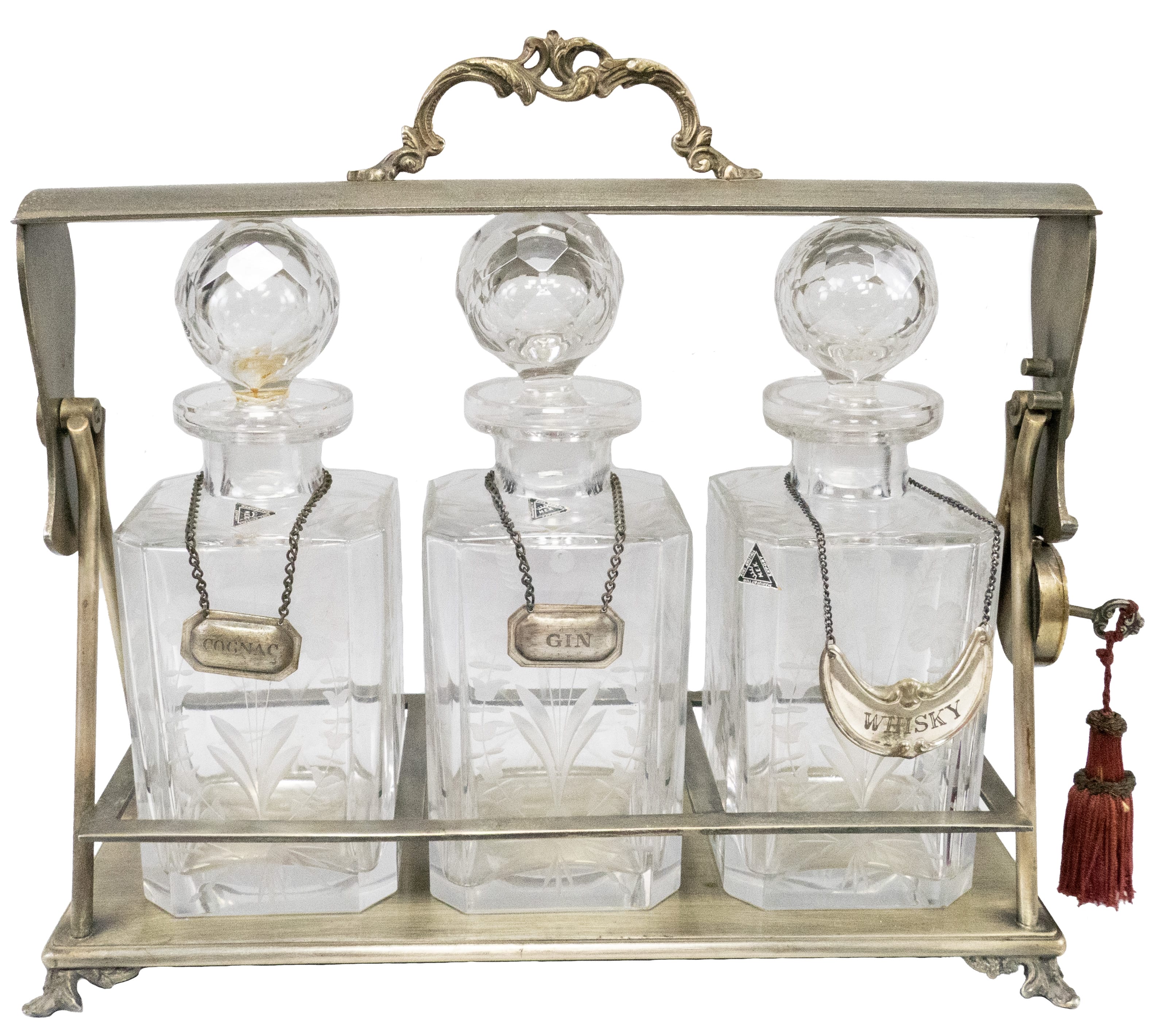 01.12 Bar cu trei compartimente pentru flacoane, portabil, mecanism de blocare, bronz și alamă, trei flacoane cu dop, cristal gravat, H 32cm, înc.sec.xX