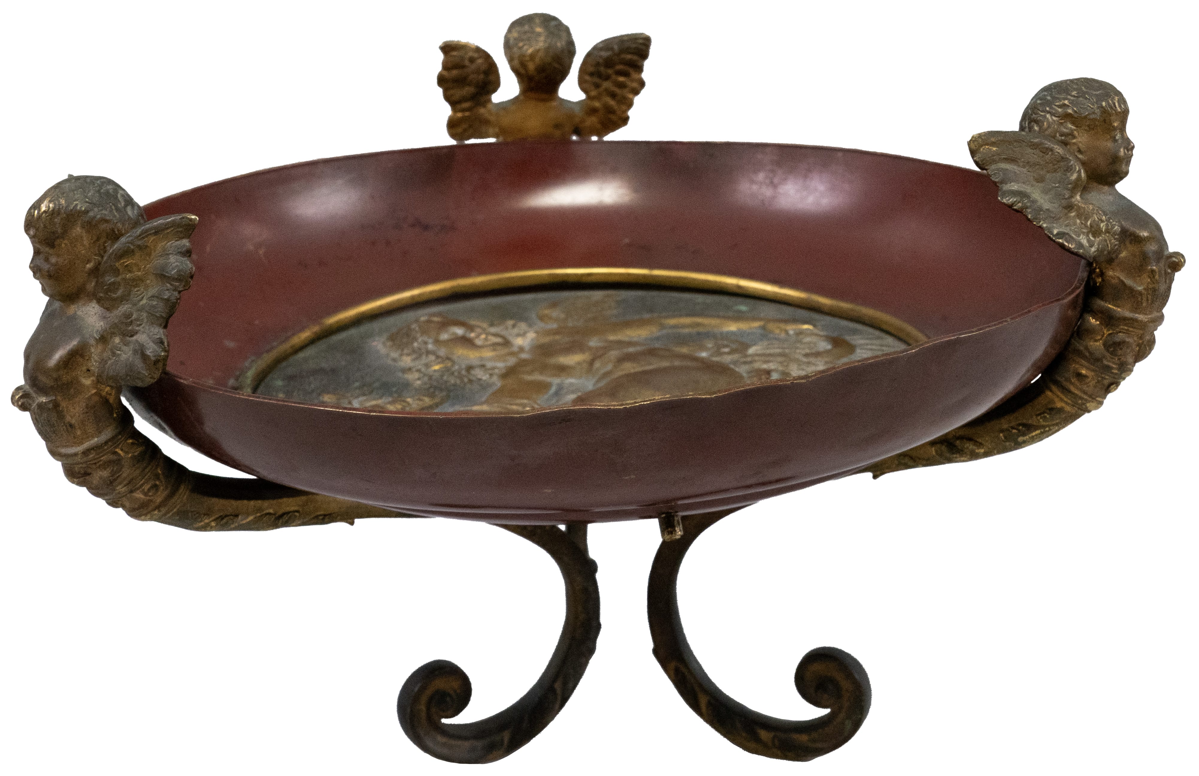 01.14 Fructieră rotundă, trei piciorușe, decor cu îngerași, bronz, dia.25cm, H 17.5cm, Franța (?), înc.sec.XX