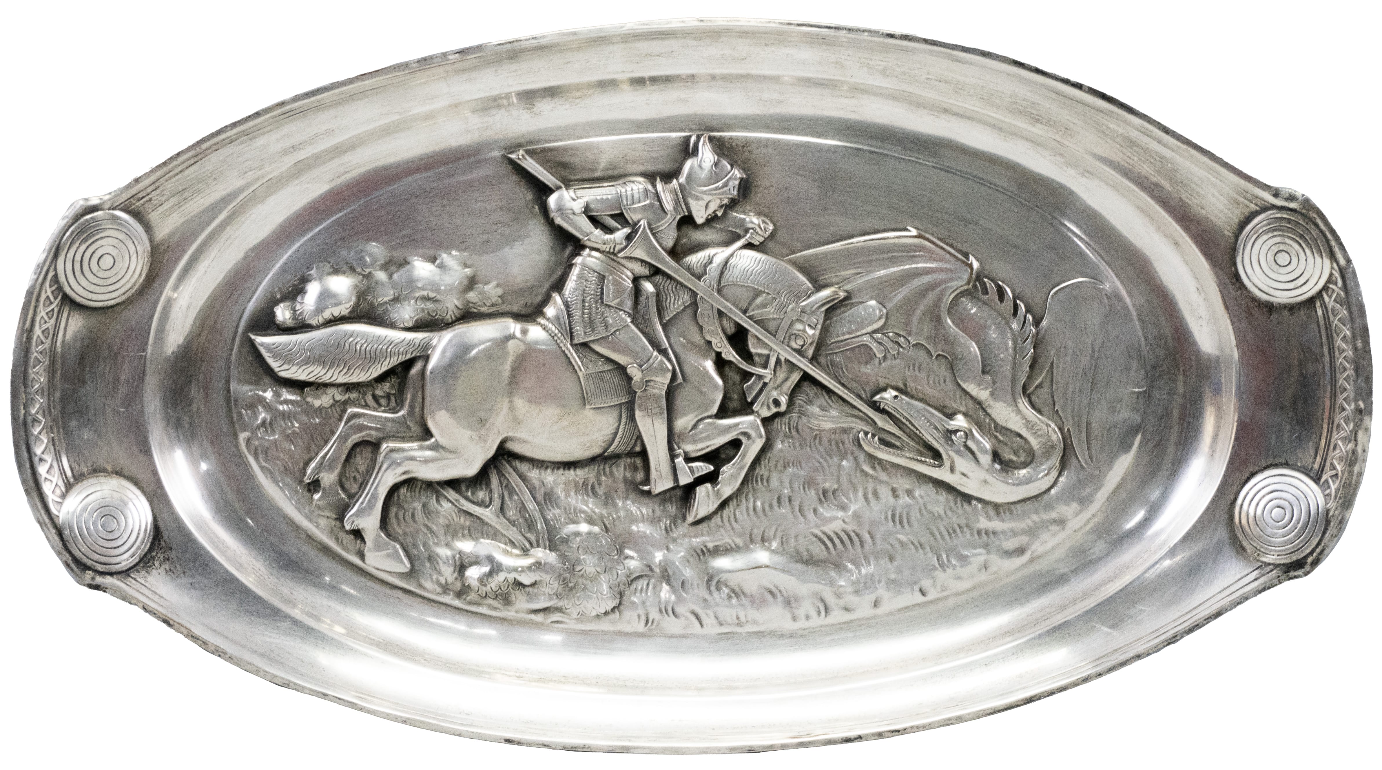 01.17 Sf. Gheorghe, platou ornamental de perete, metal placat cu argint, 25.5x47cm, perioada interbelică