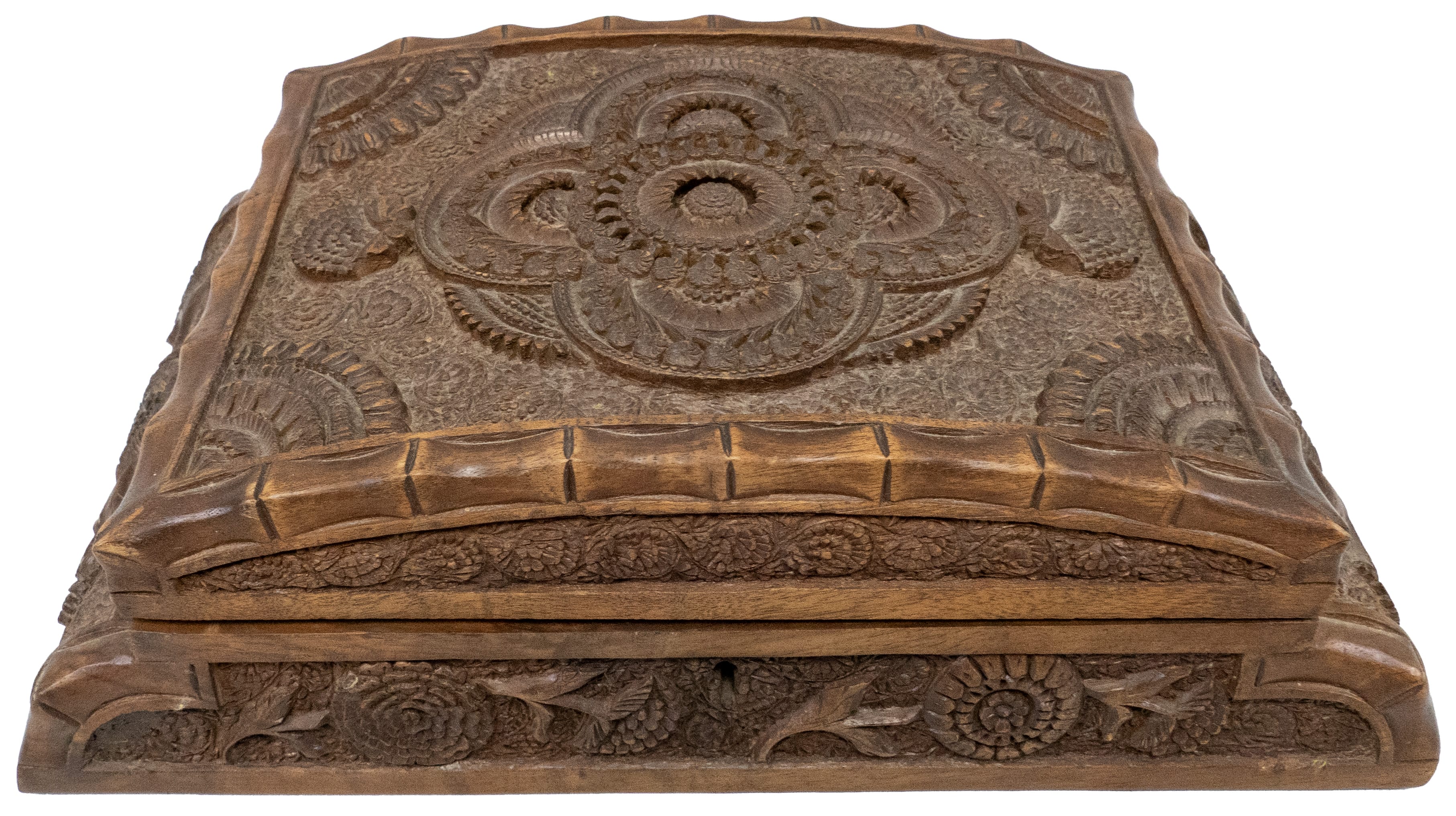 01.20 Casetă cu capac, mecanism pentru cheie, interior compatimentat, lemn exotic sculptat, 27.5x16.5x8,5cm, Extrem Orientm perioada interbelică