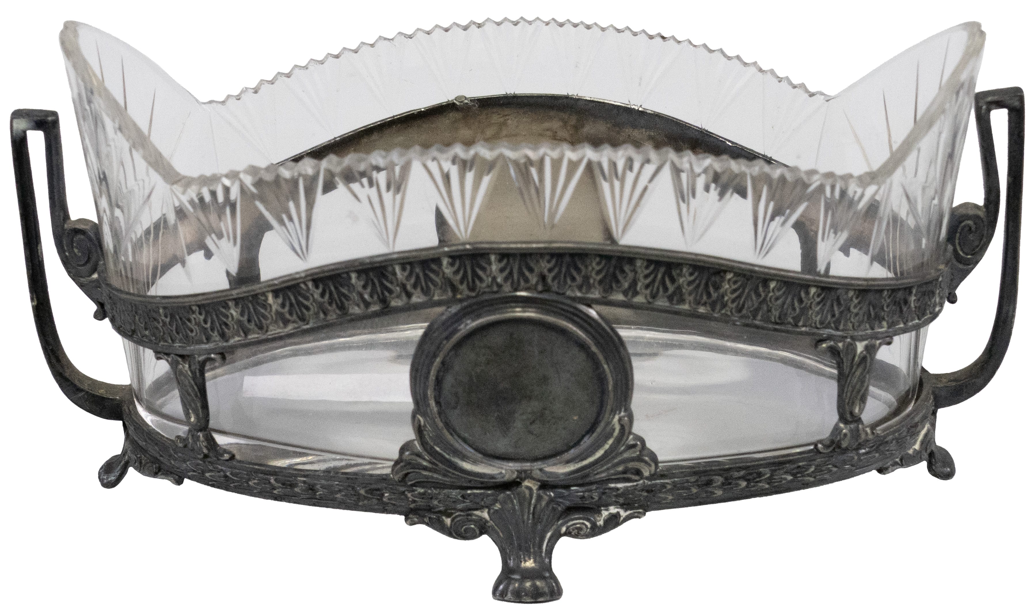 01.23 Fructieră ovală cu anse, miniaturală, cristal gravat și placat cu argint, metal traforat, marcată WMF, elemente Napoleon III, 15.5x7,5cm, înc.sec.XX, mici defecte la cristal