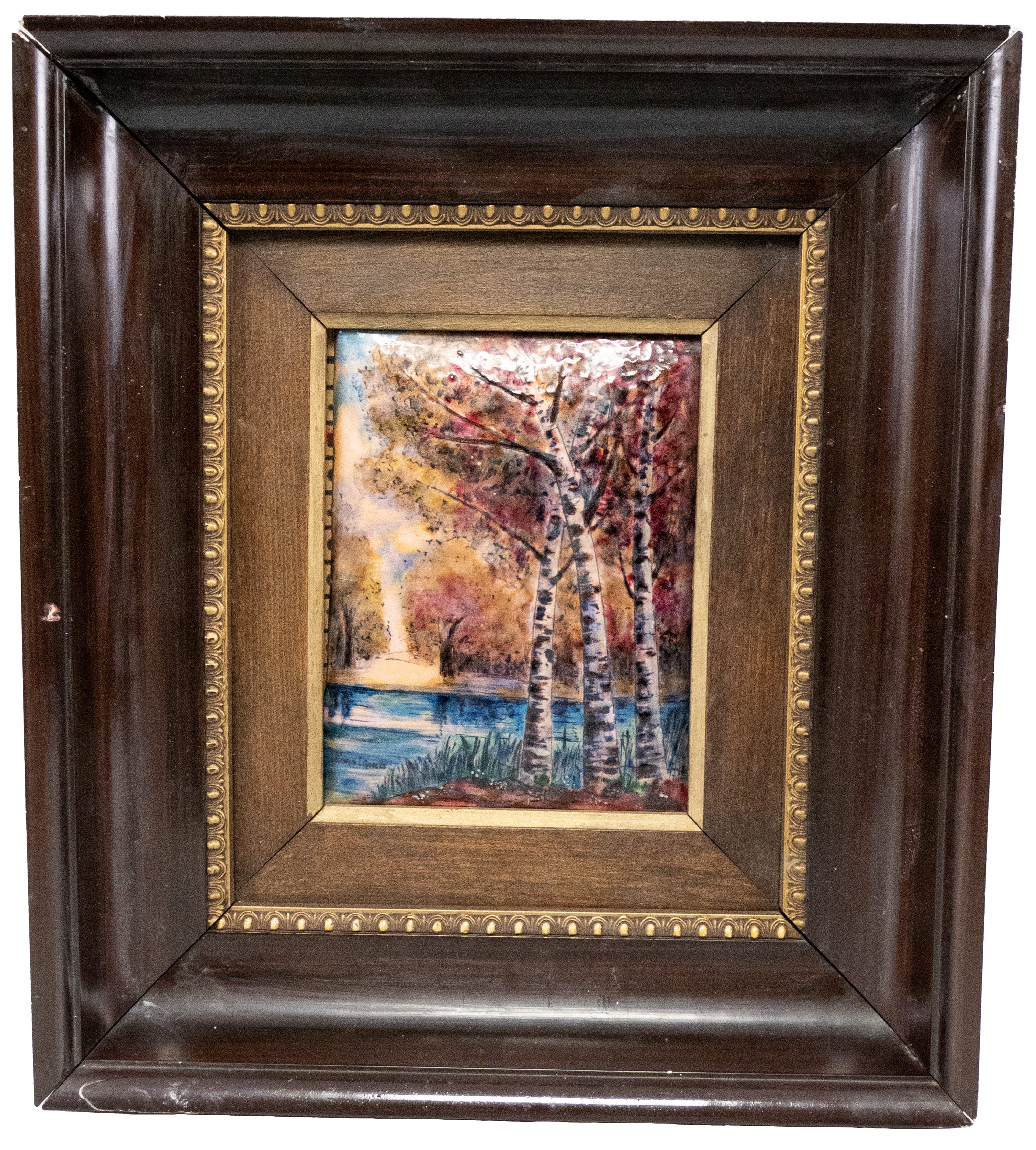 01.34 Peisaj cu lac-panou ornamental, placă de cupru, pictată cu email, înrămată, semnată, 16.5x12.5cm, înc.sec.XX