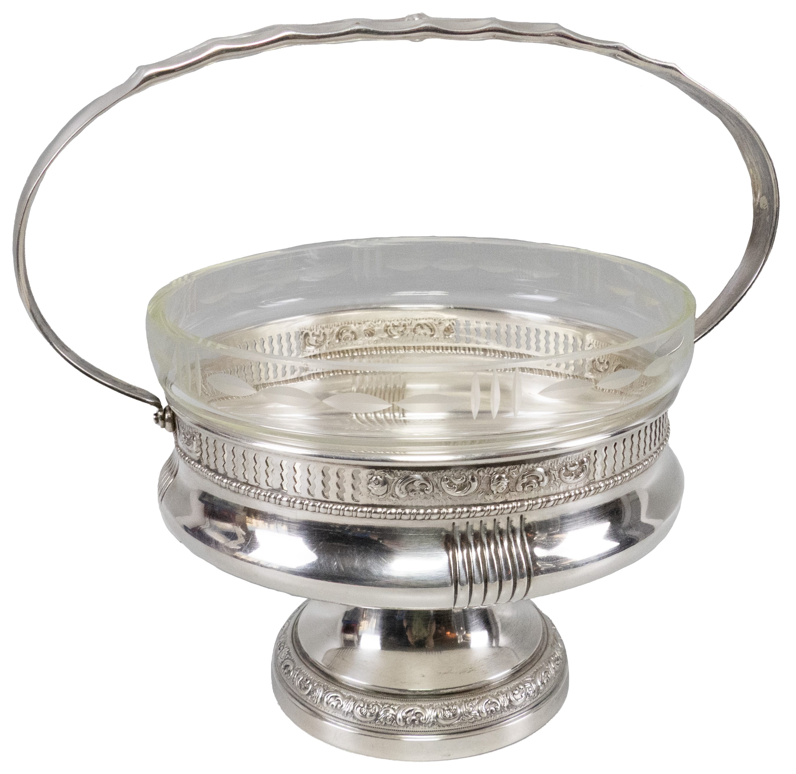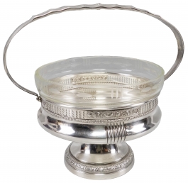 01.02 Fructieră rotundă, cu ansă rabatabilă, picioruș central, metal placat cu argint, decorat în relief, traforat, cristal gravat, marcată, dia.17,5cm, H 14cm, perioada interbelică