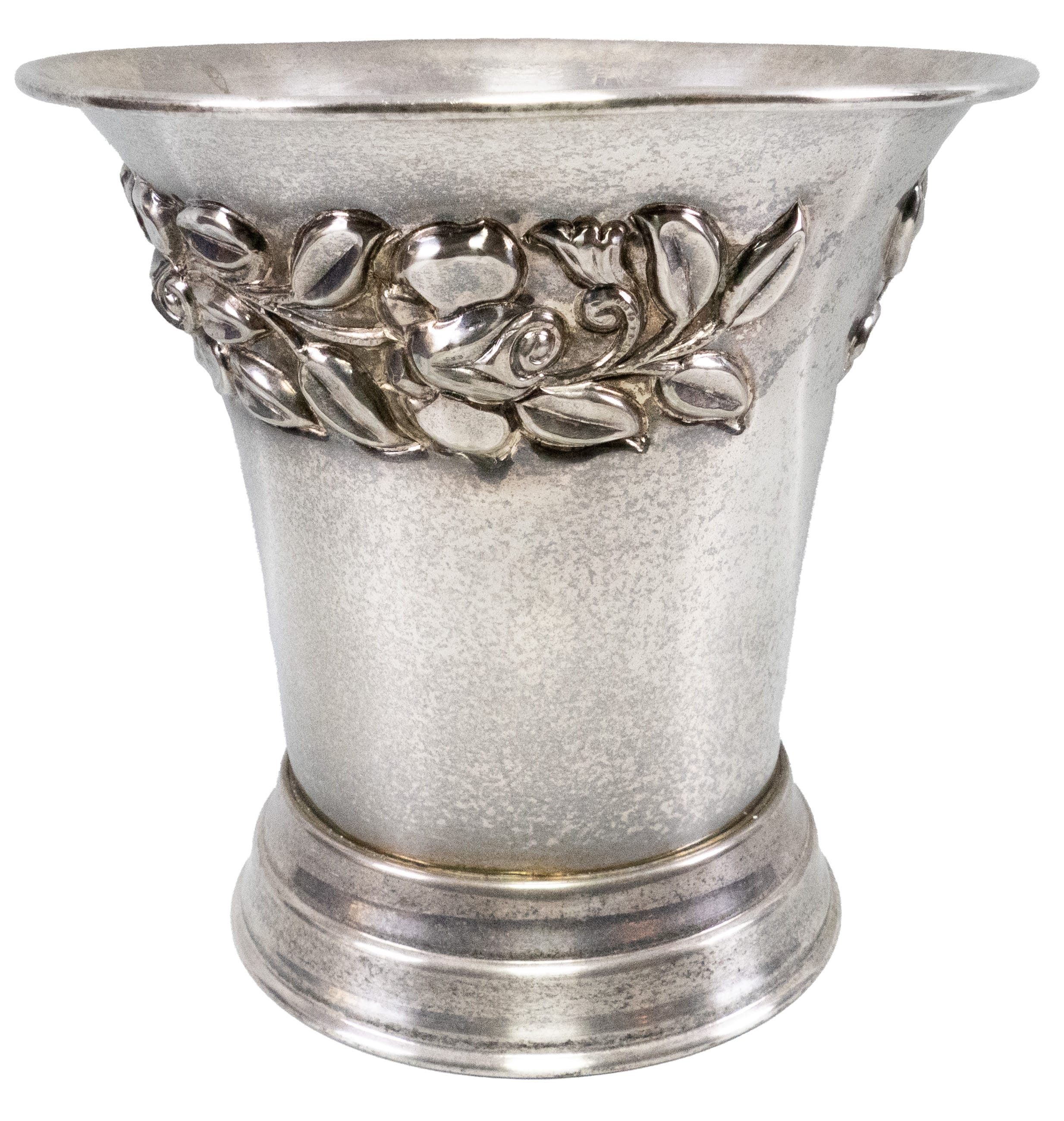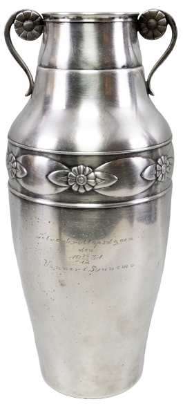 01.10 Cupă cu anse, metal argintat, decorat în relief, datată 1931, marcată, H 35.5cm, perioada interbelică
