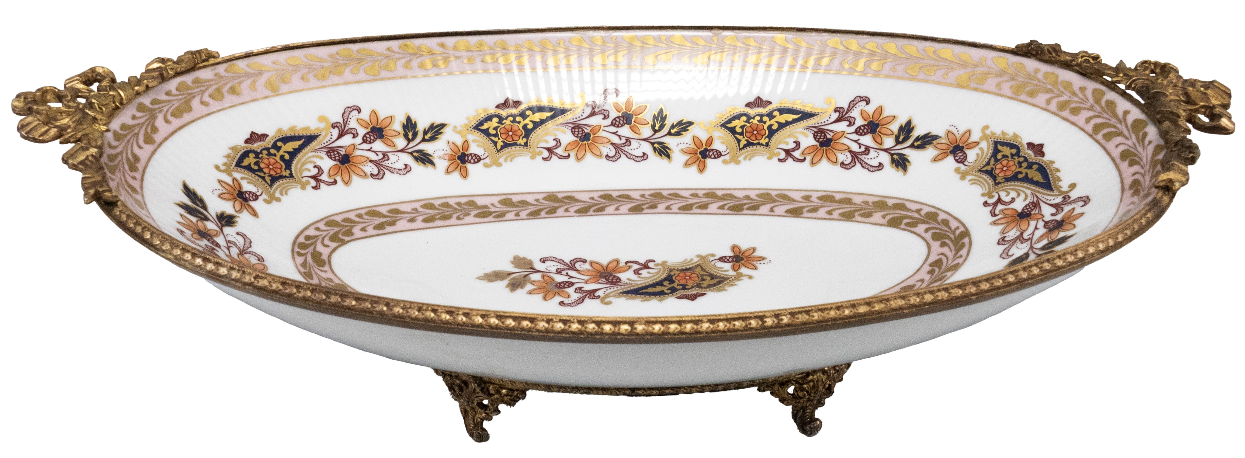 01.04 Castron oval, patru piciorușe, porțelan decorat cu flori, montat în bronz, marcat Limoges, elemente Louis XVI, 36x20.5x9cm, a II-a jum.sec.XX