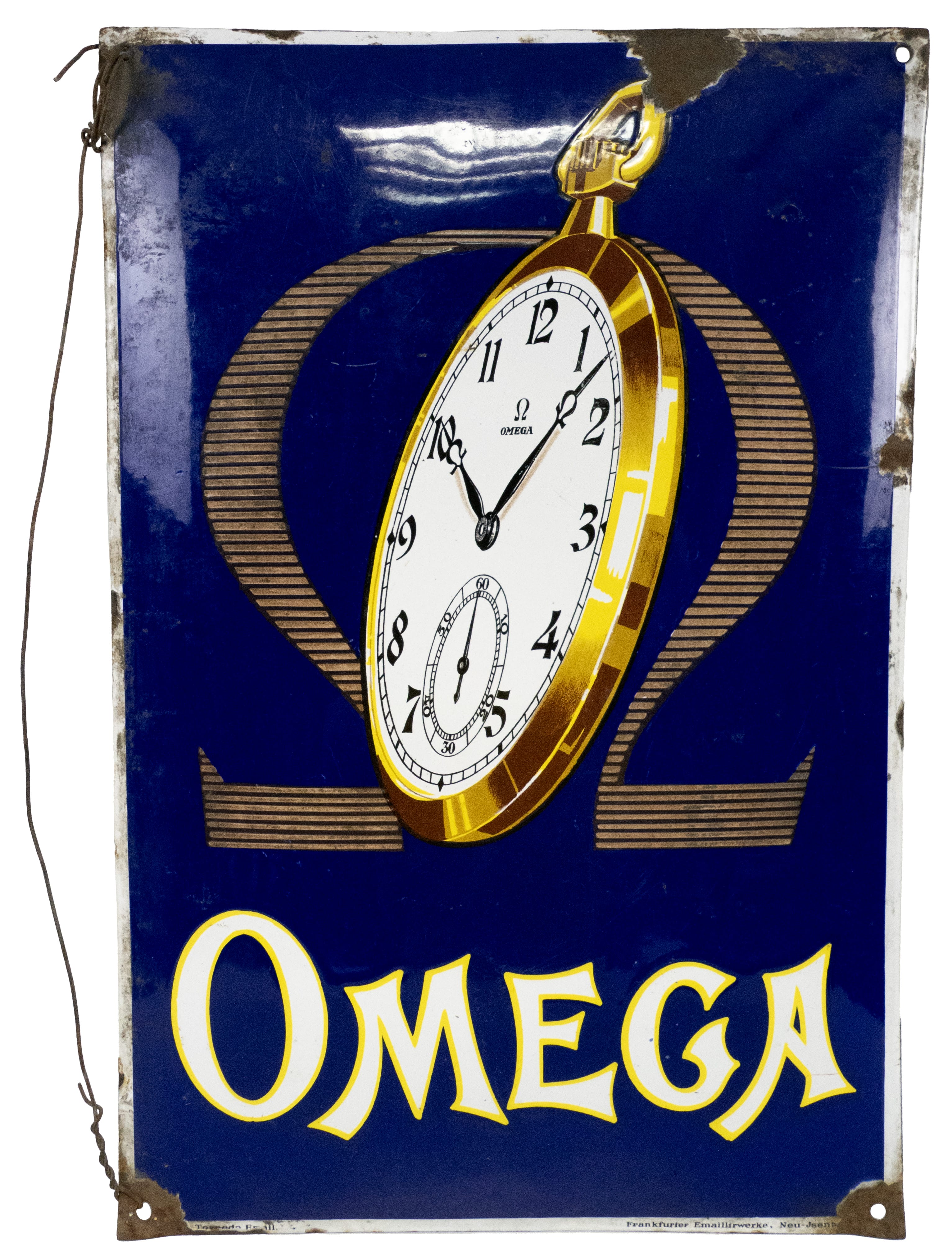 01.20 Panou de reclamă Omega, metal ambutisat și abțibild, 60x38.5cm, perioada interbelică, mici defecte