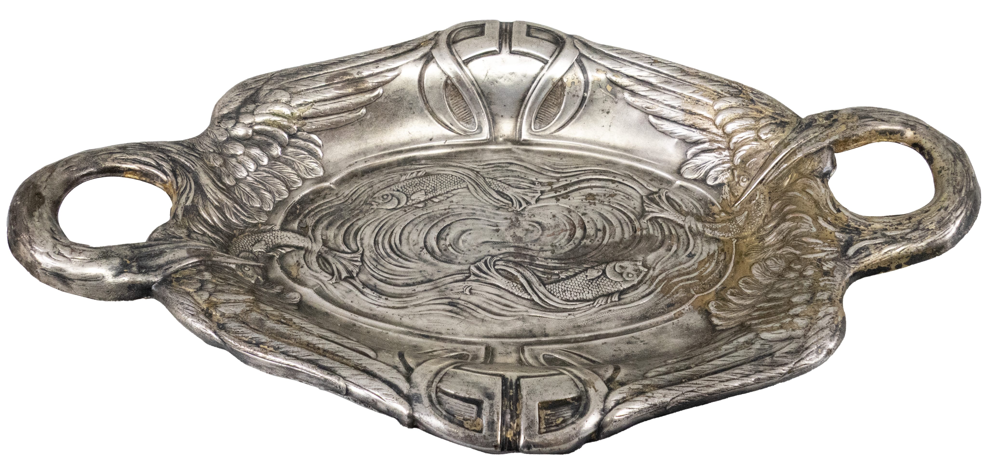 01.29 Tavă cu anse-miniatură, pentru pește, metal decorat în relief, stil Art Nouveau, 26x15cm, înc.sec.XX