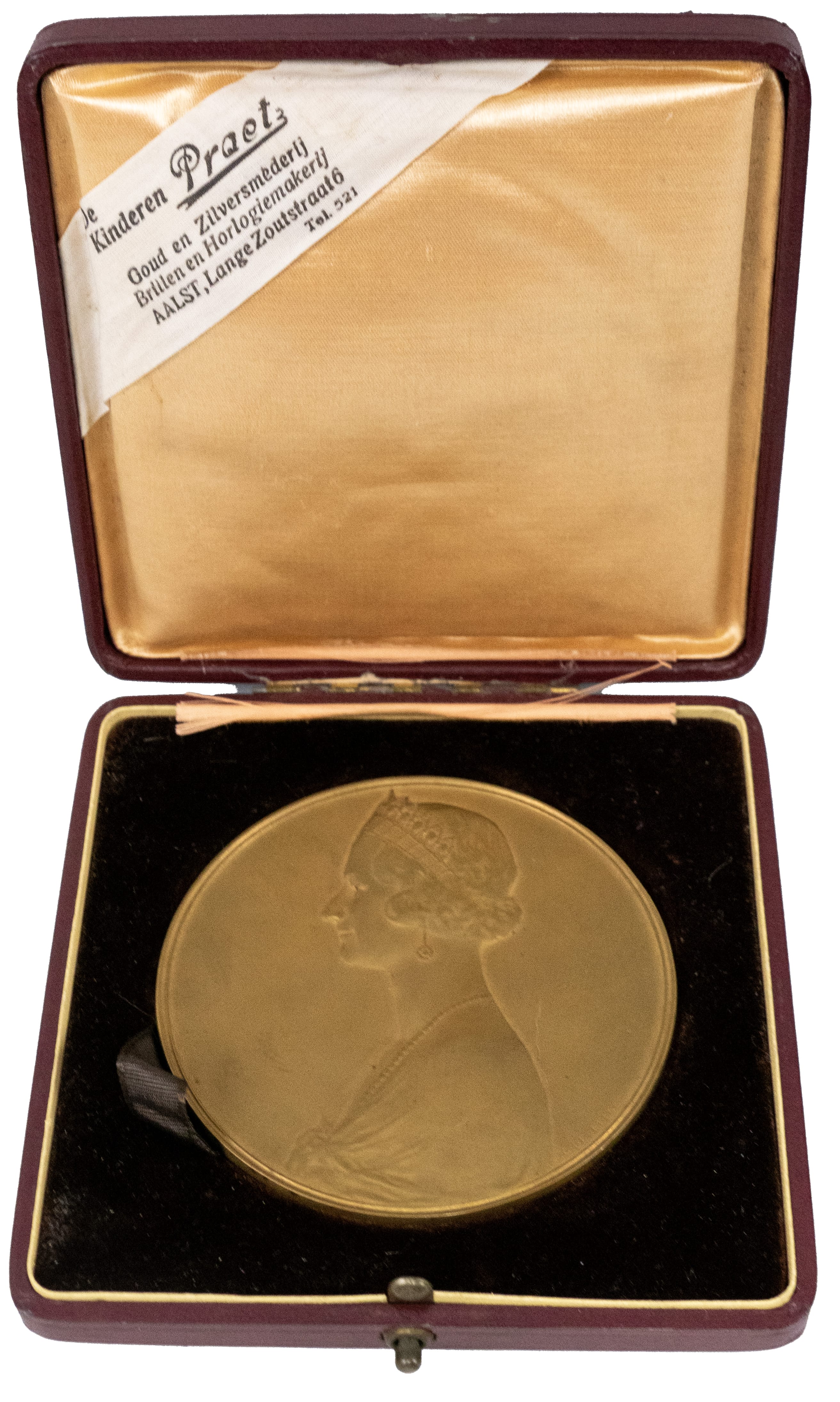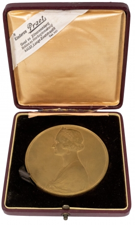 01.32 Sa Majeste Astrid-la Reine de Grace 1934-1935, plachetă omagială, bronz dore semnată C.Devreese, dia. 7,5cm, 1938, casetă originală