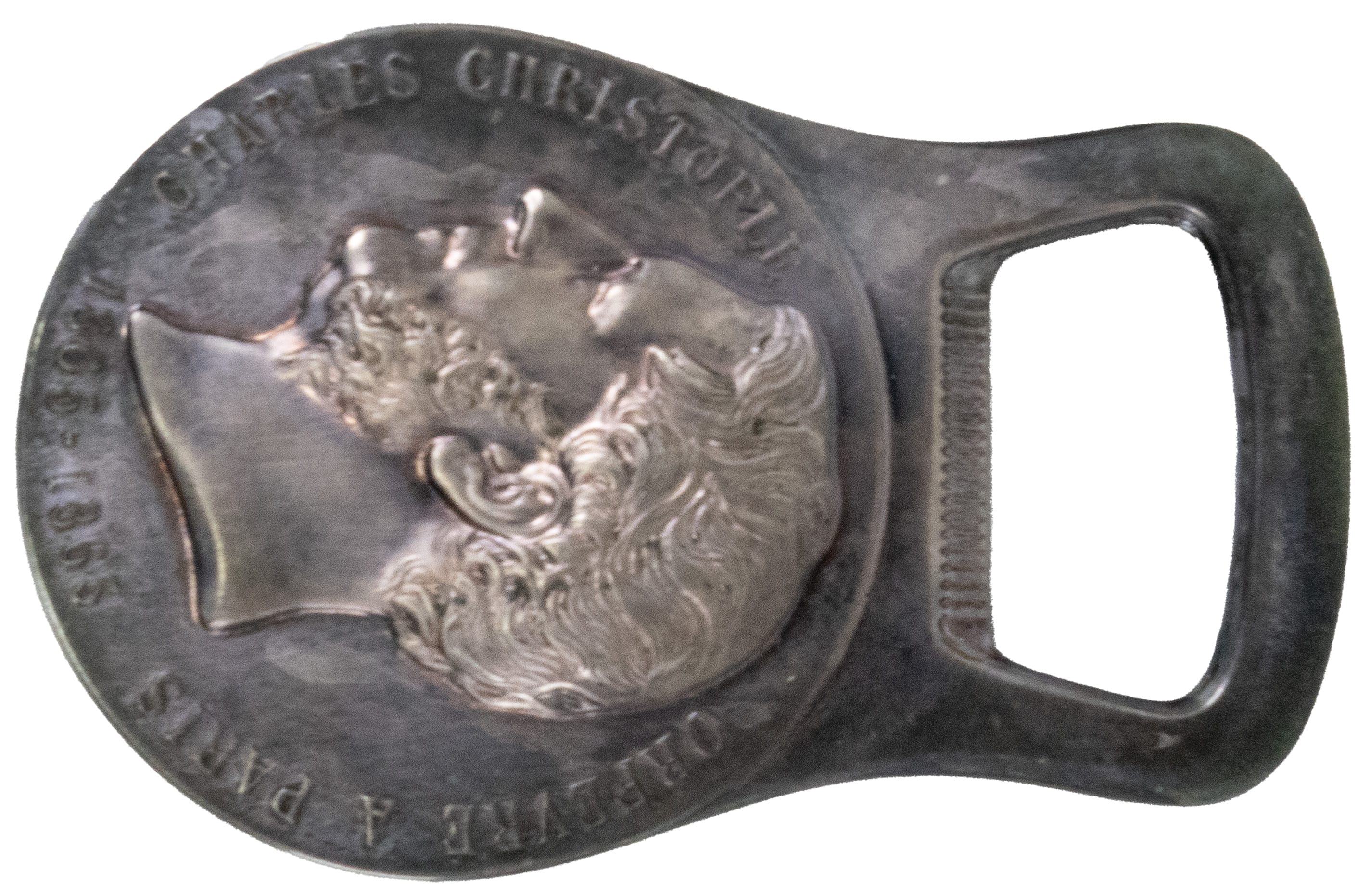 01.33 Desfăcător de bere, decorat cu portretul lui Charles Christofle (1805-1863), marcat Christofle, jum.sec.XX, casetă originală