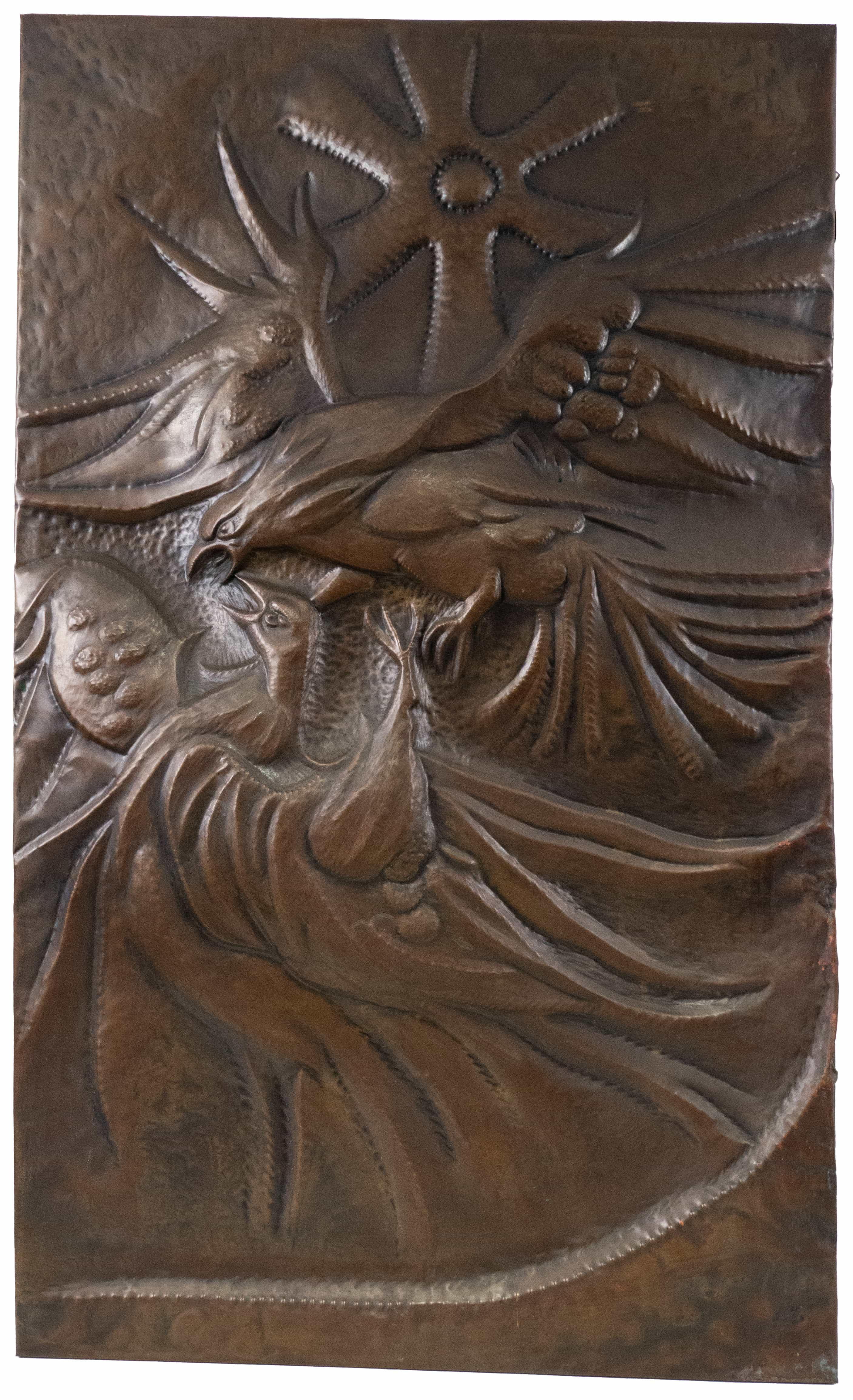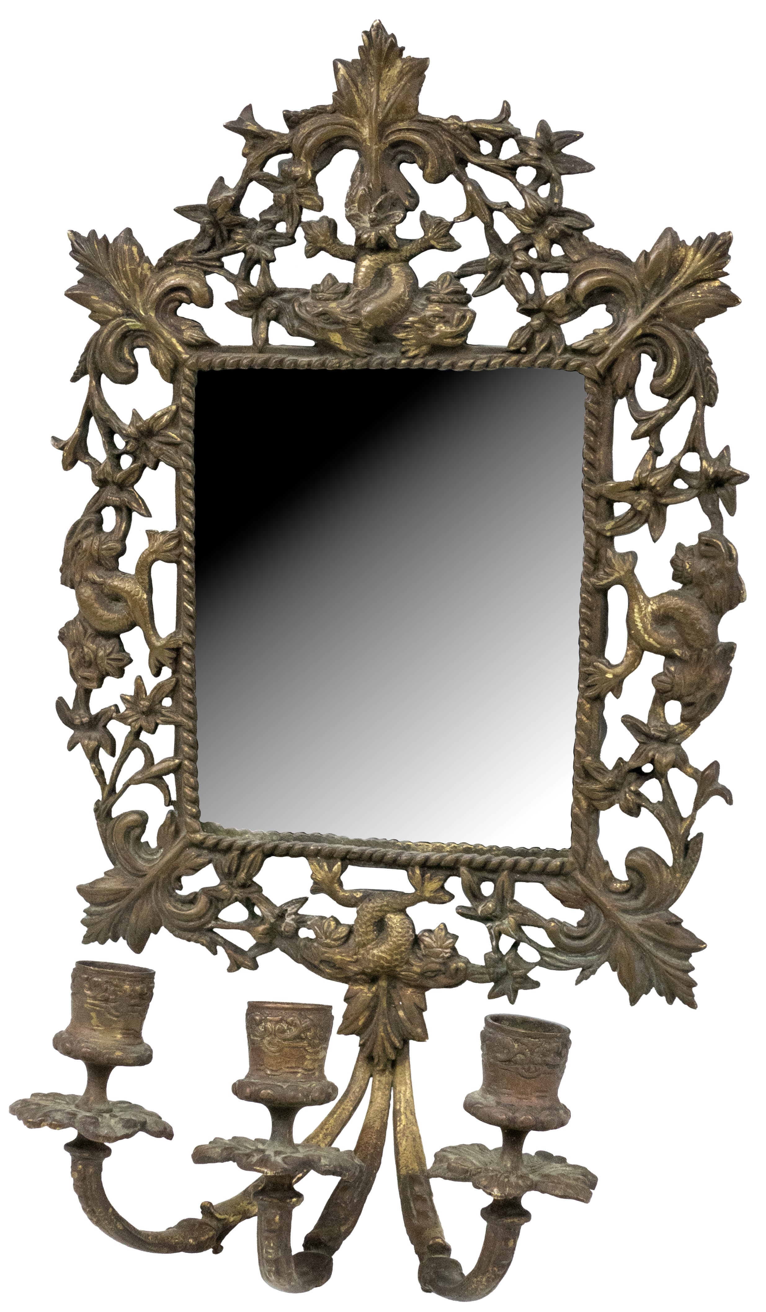 01.01 Oglindă de perete cu trei suporturi pentru lumânări, bronz decorat în relief cu dragoni, H 42cm, înc.sec.XX