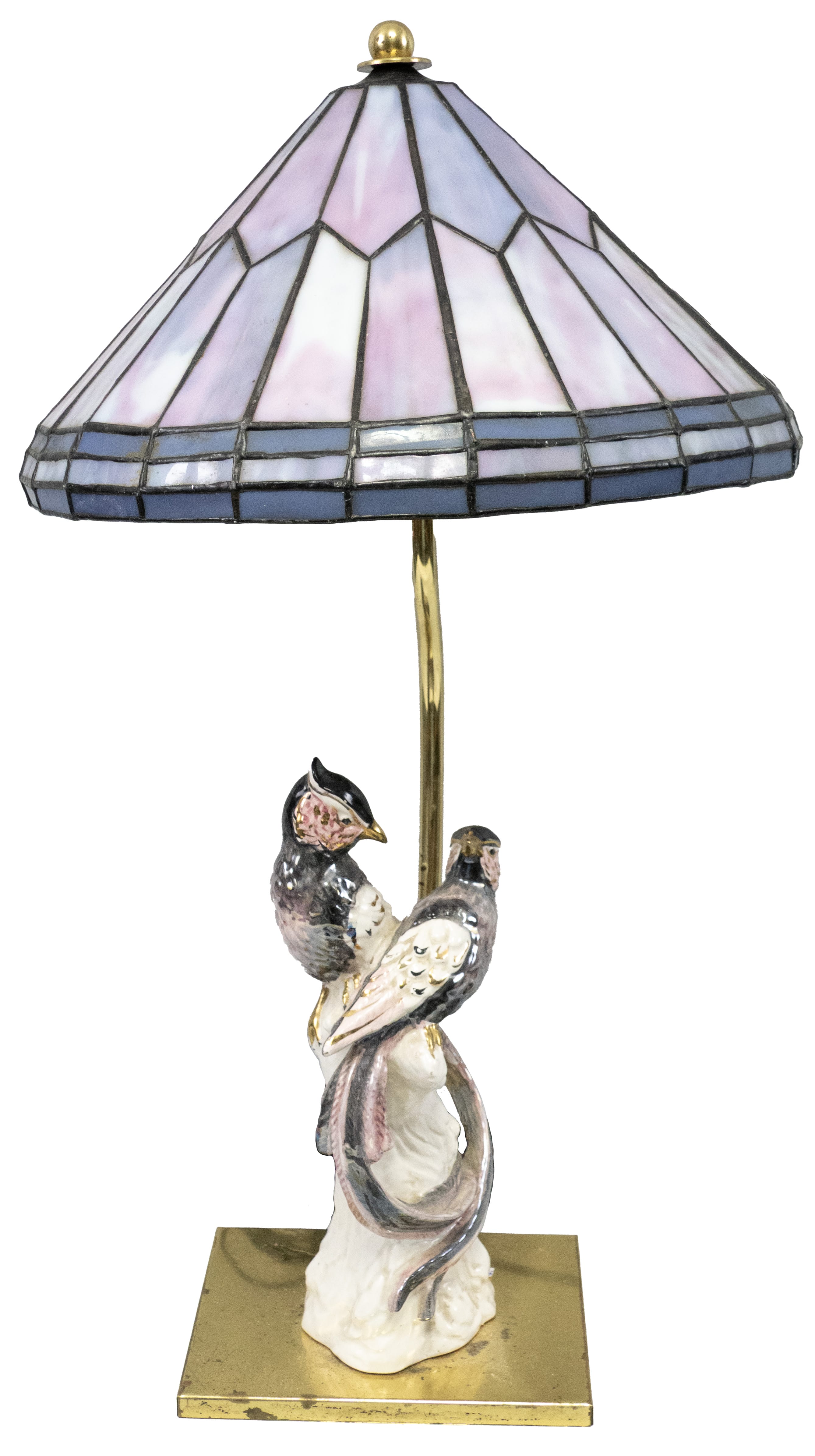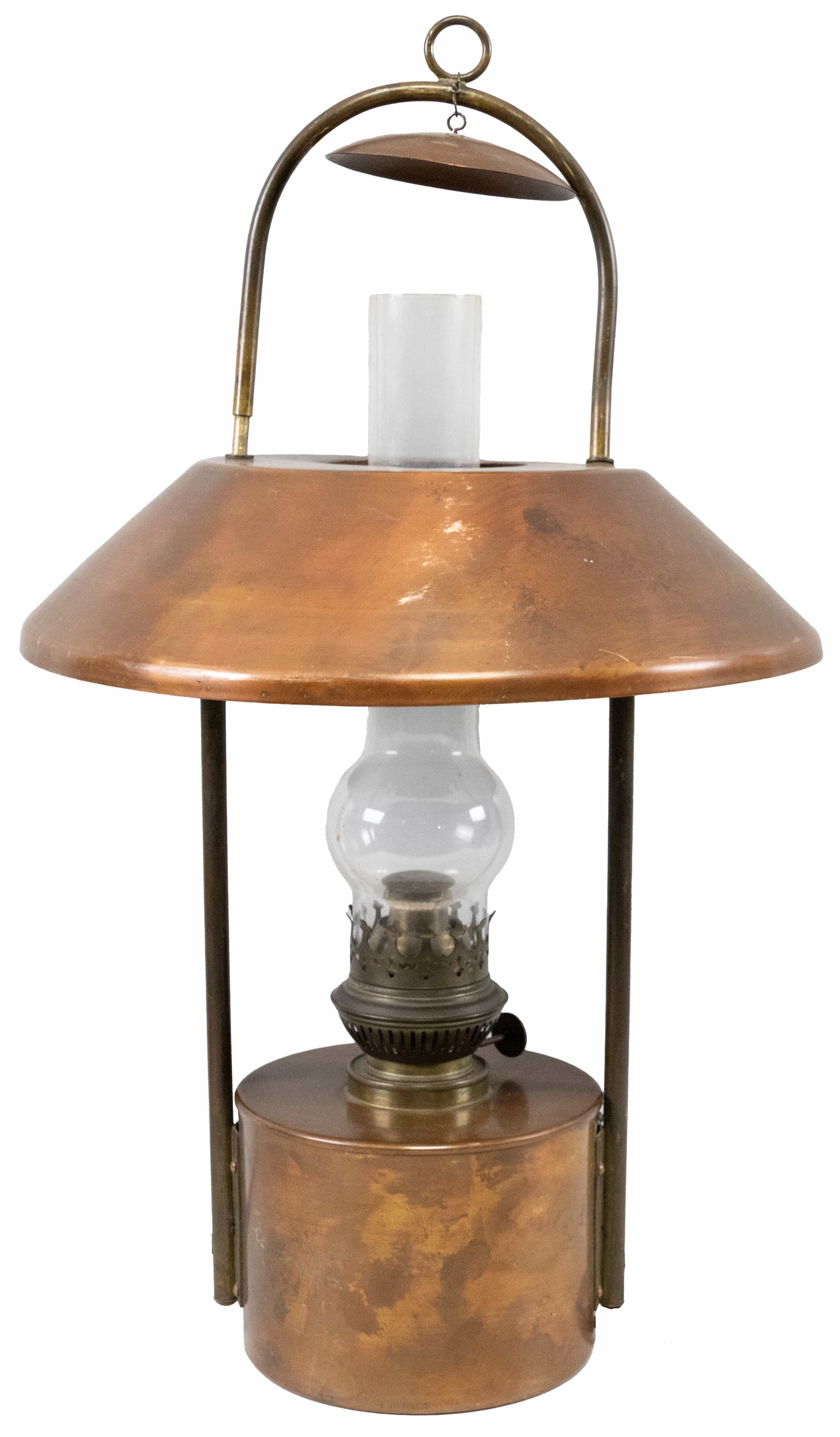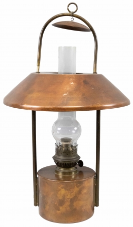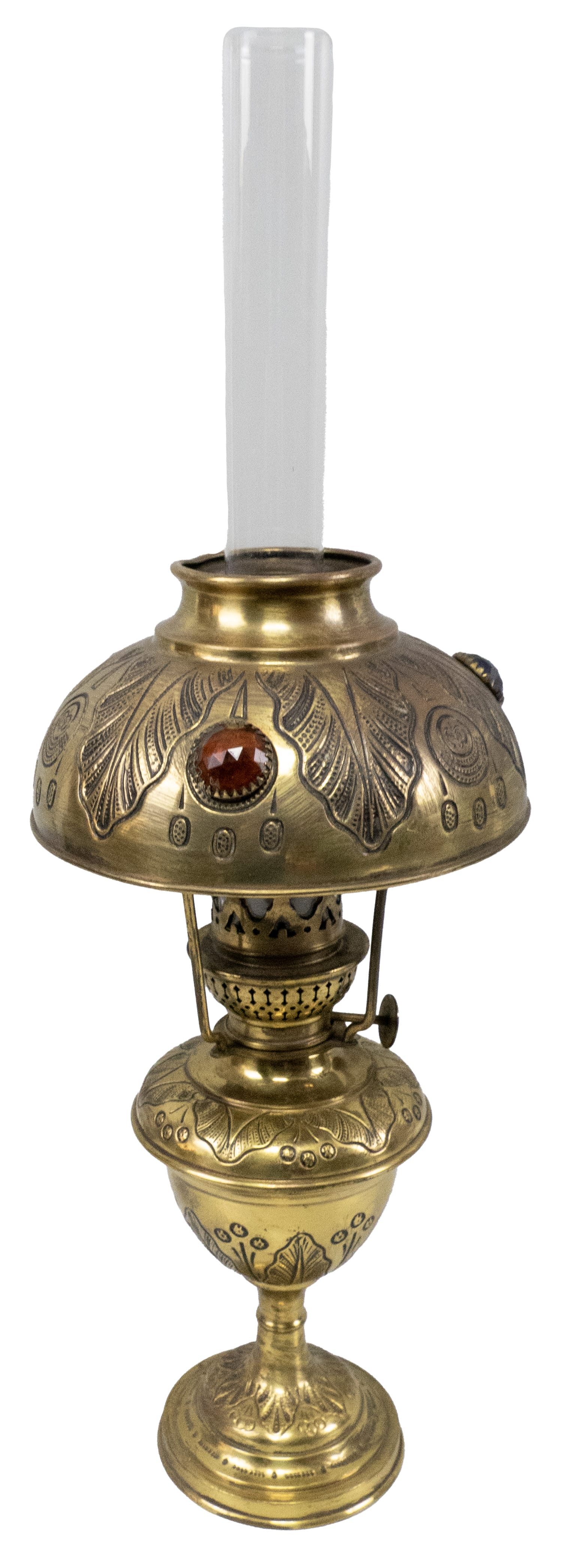 01.02 Lampă de masă cu petrol, alamă și sticlă, cabochoane de sticlă colorată, H 42.5cm (total), perioada interbelică