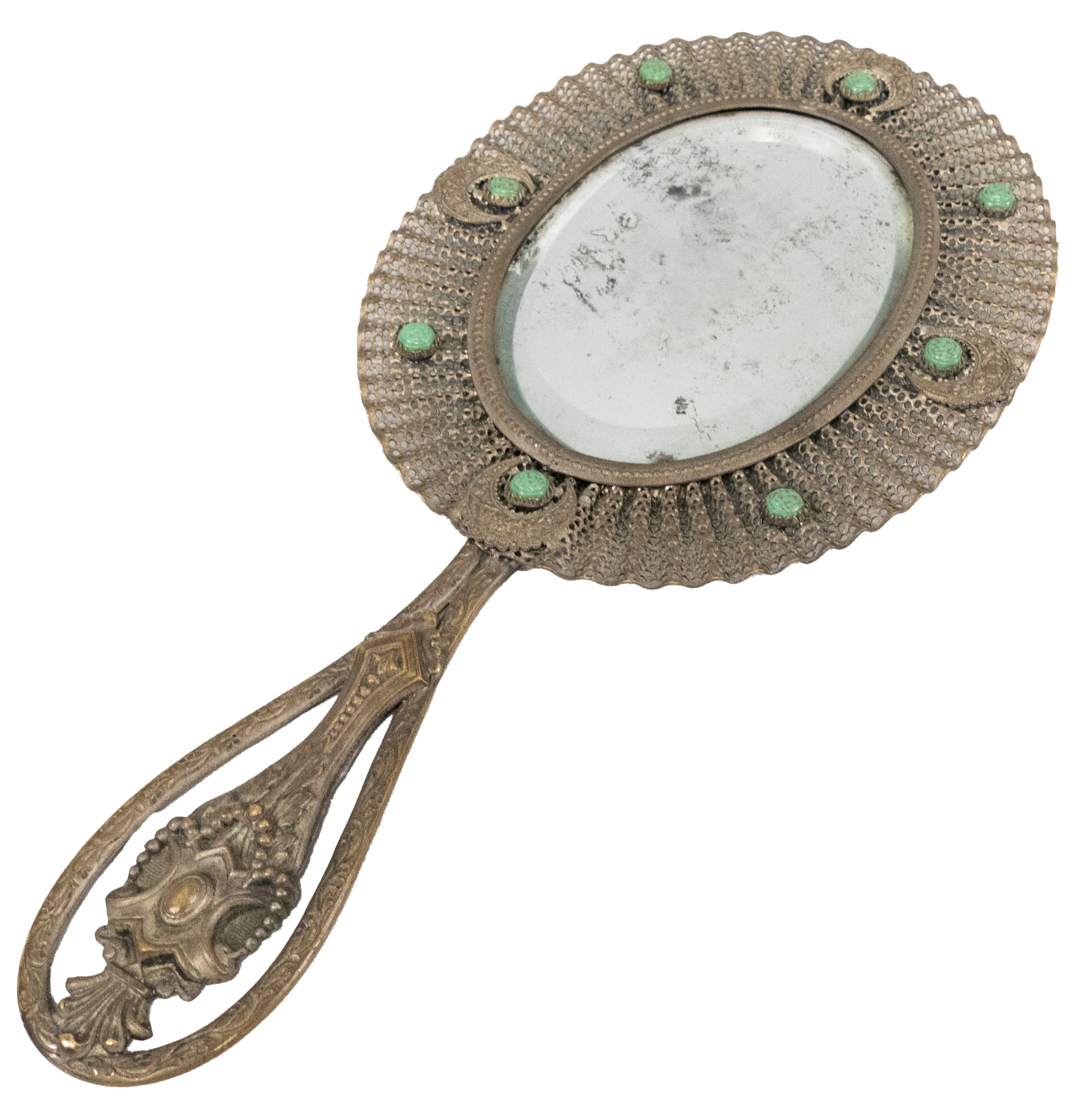 01.05 Oglindă de mână, metal argintat, decorat în relief, filigranat, cristal bizotat, L 24cm, înc.sec.XX