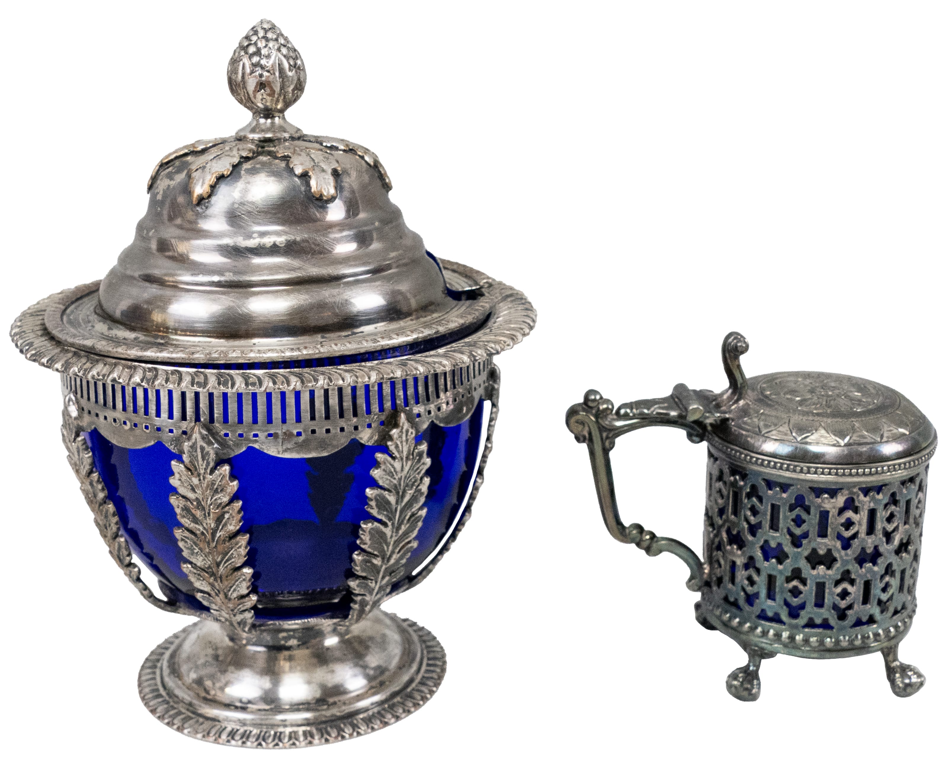01.12 Două vase cu capac, metal placat cu argint, traforat, și sticlă colorată, unul marcat, H 10/18cm, Anglia, perioada interbelică