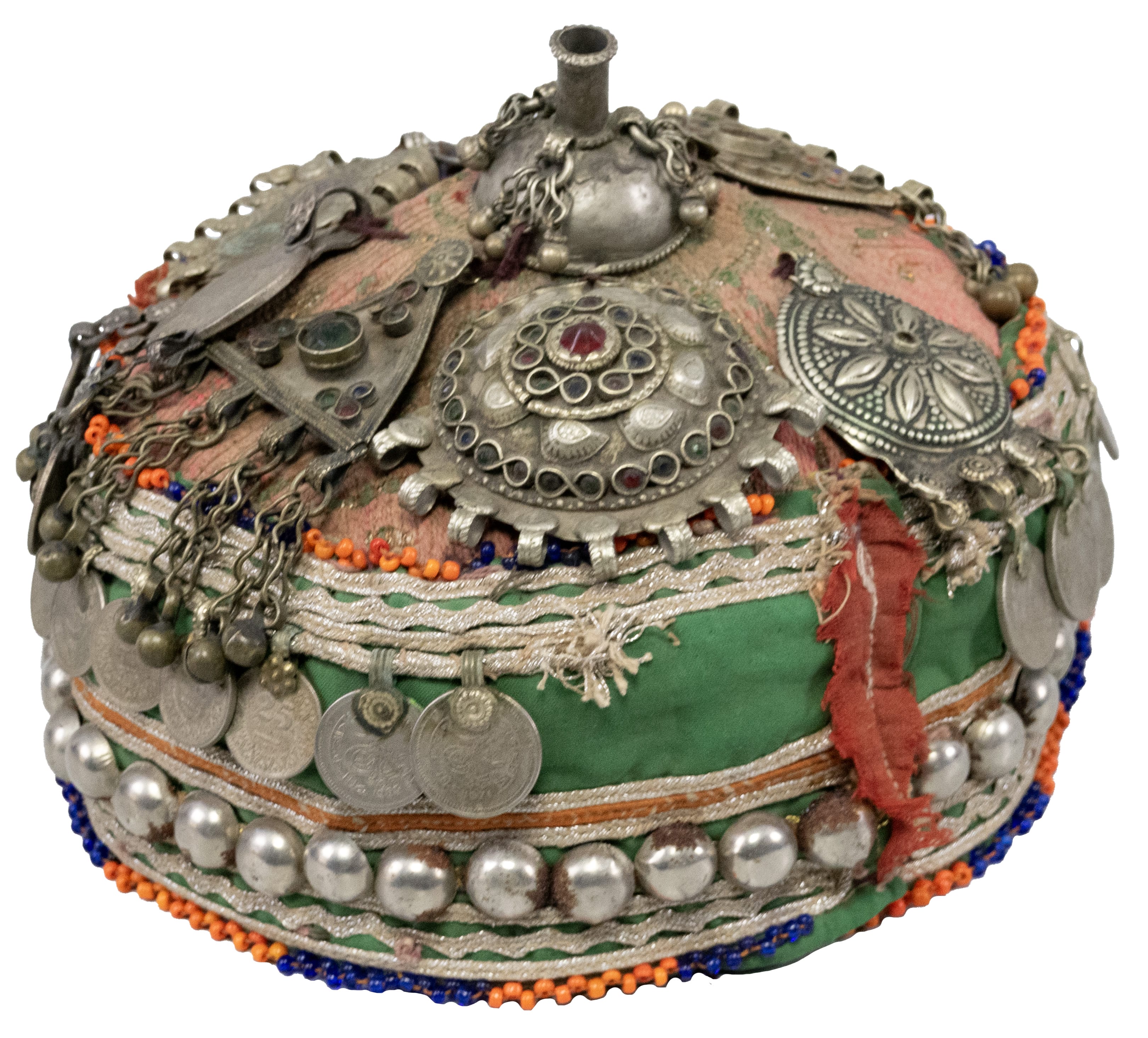 01.15 Fes, material textil, monede, accesorii metalice, mărgele și cabochoane din sticlă colorată, Orientul Mijlociu, perioada interbelică, piesă de colecție
