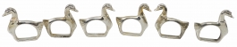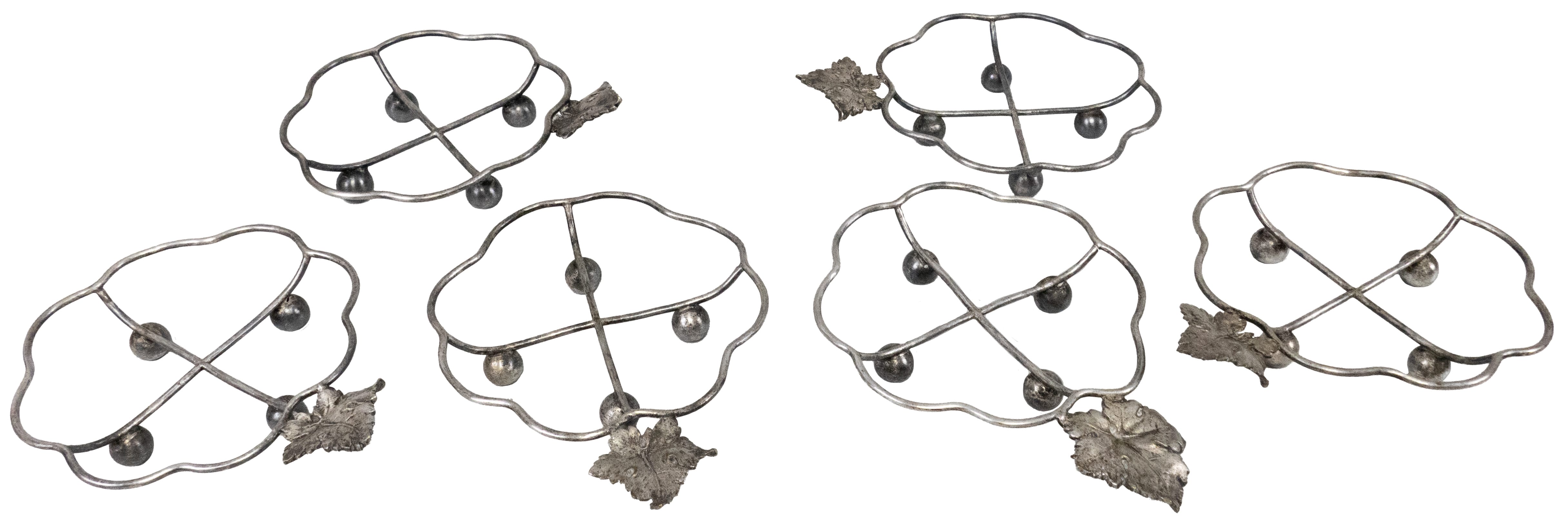01.39 Șase suporturi de sârmă, pentru farfurii aperitive, ansă și patru picioare, contur lobat, dia.11,5cm