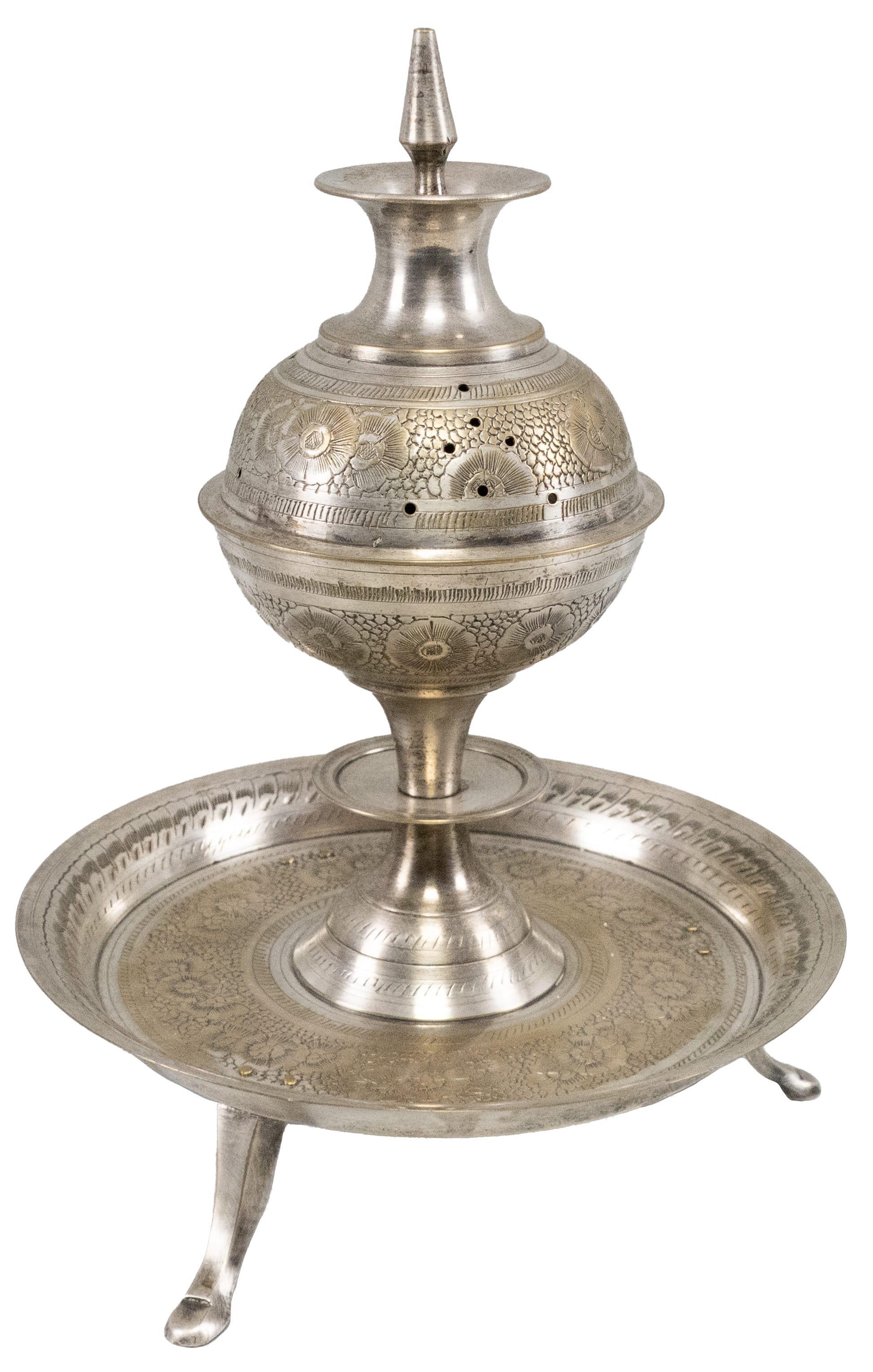 01.41 Brulee-Parfum, metal argintat, gravat, trei picioare, H 28cm, Orientul Mijlociu, jum.sec.XX