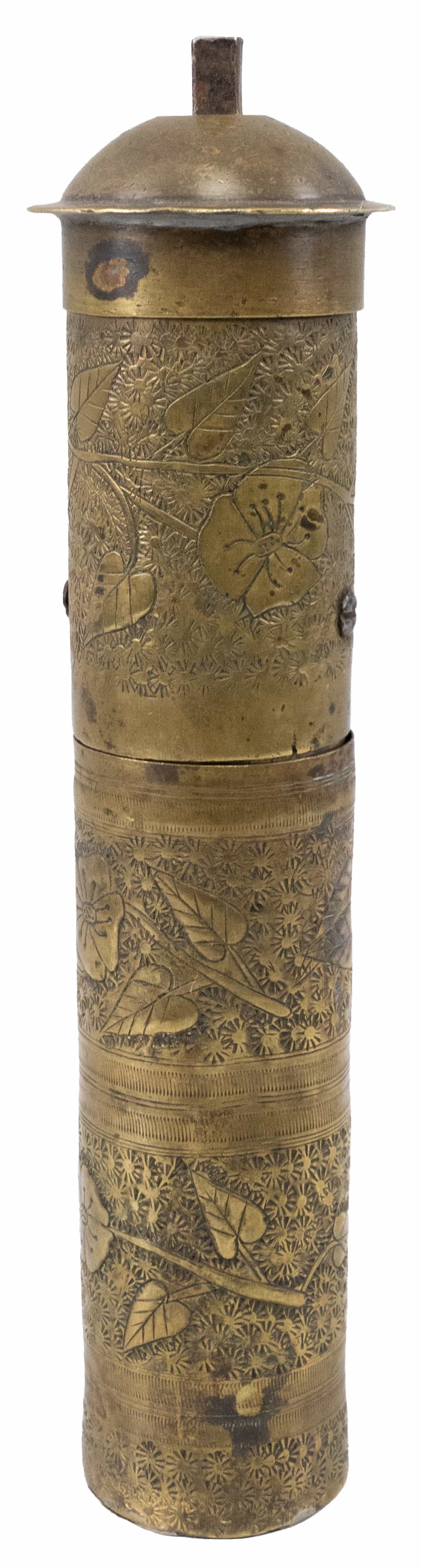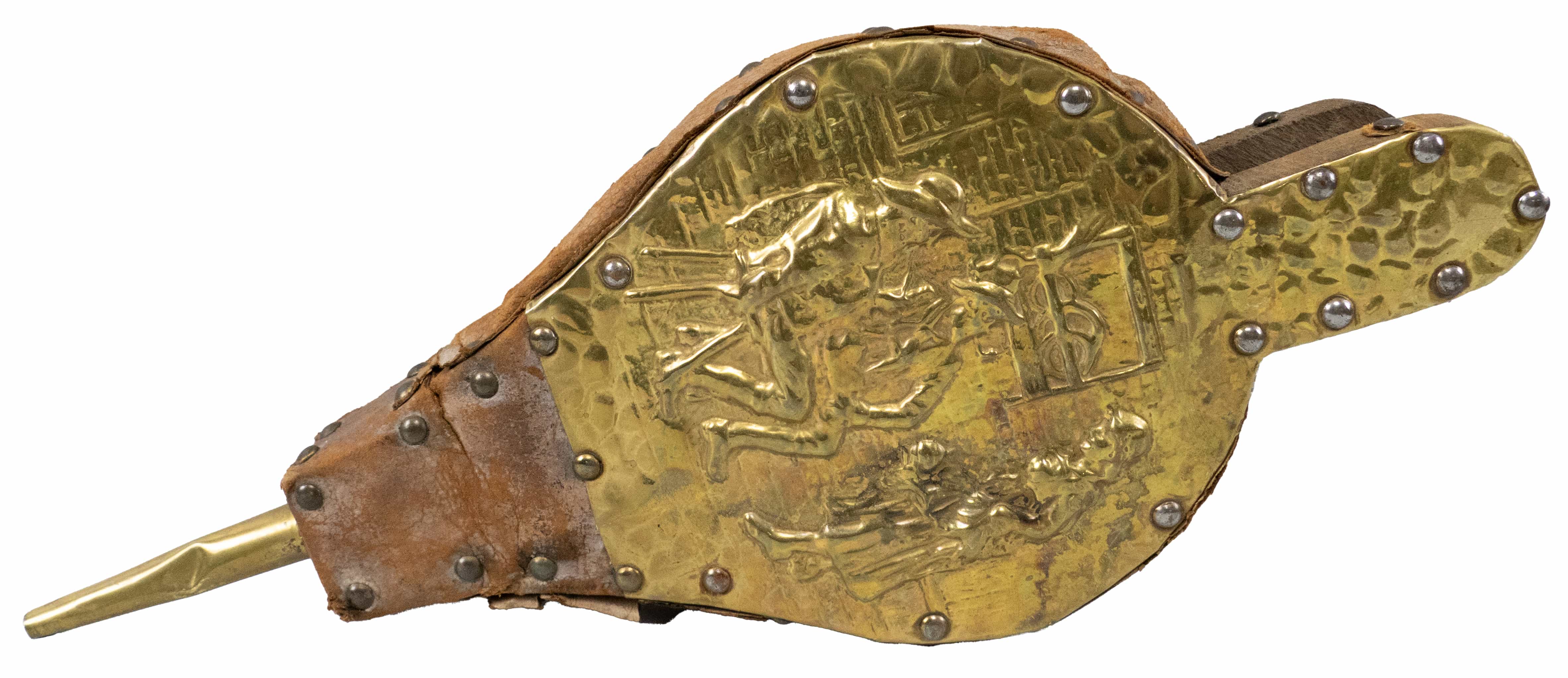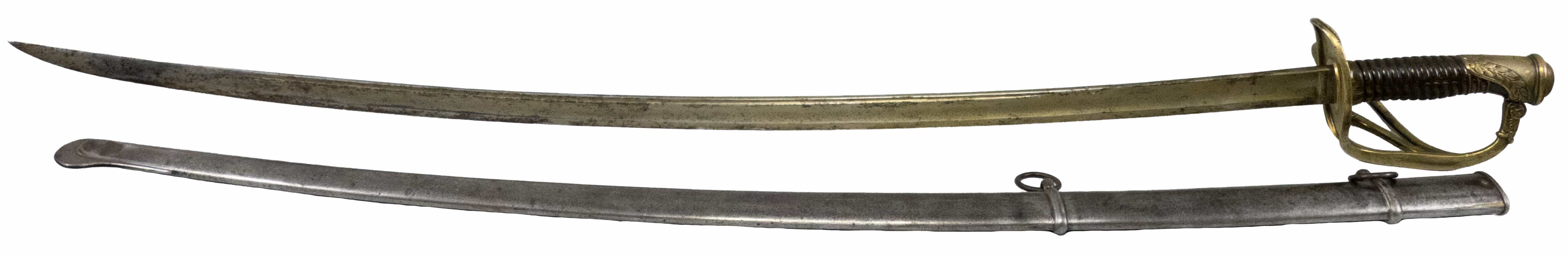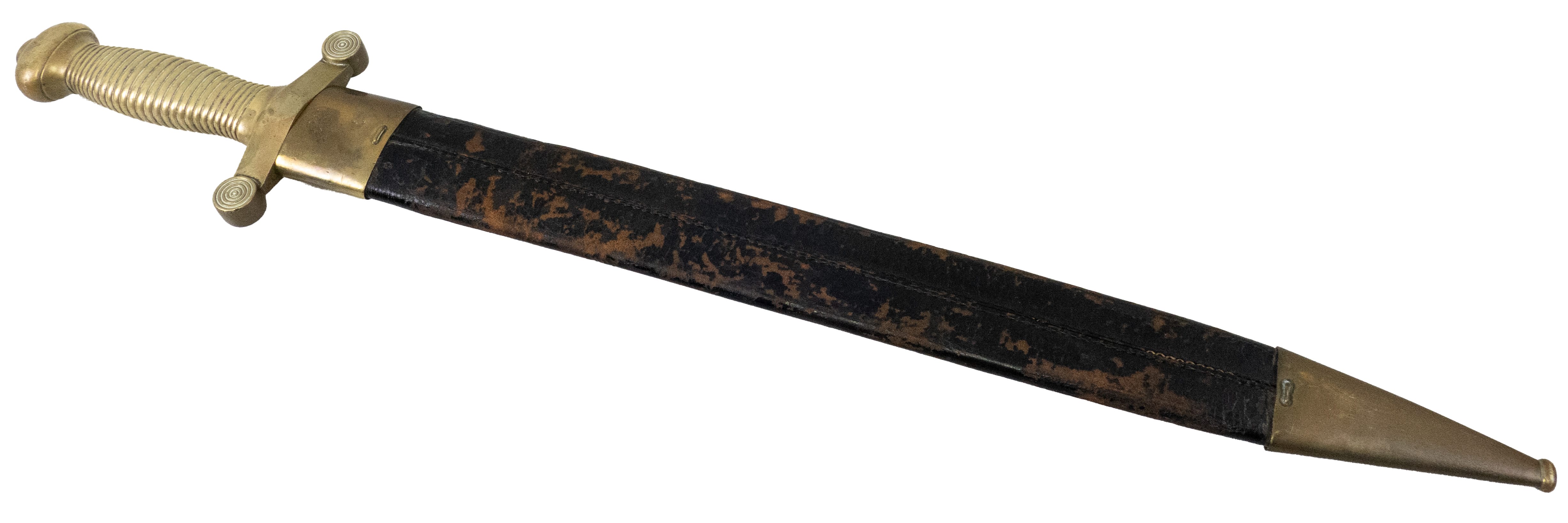 01.42 Sabie cu teacă, bronz, oțel, piele și alamă, semnată și poansonată de meșter, marca atelierului, datată 1882, L 64cm, sf.sec.XIX, piesă de colecție