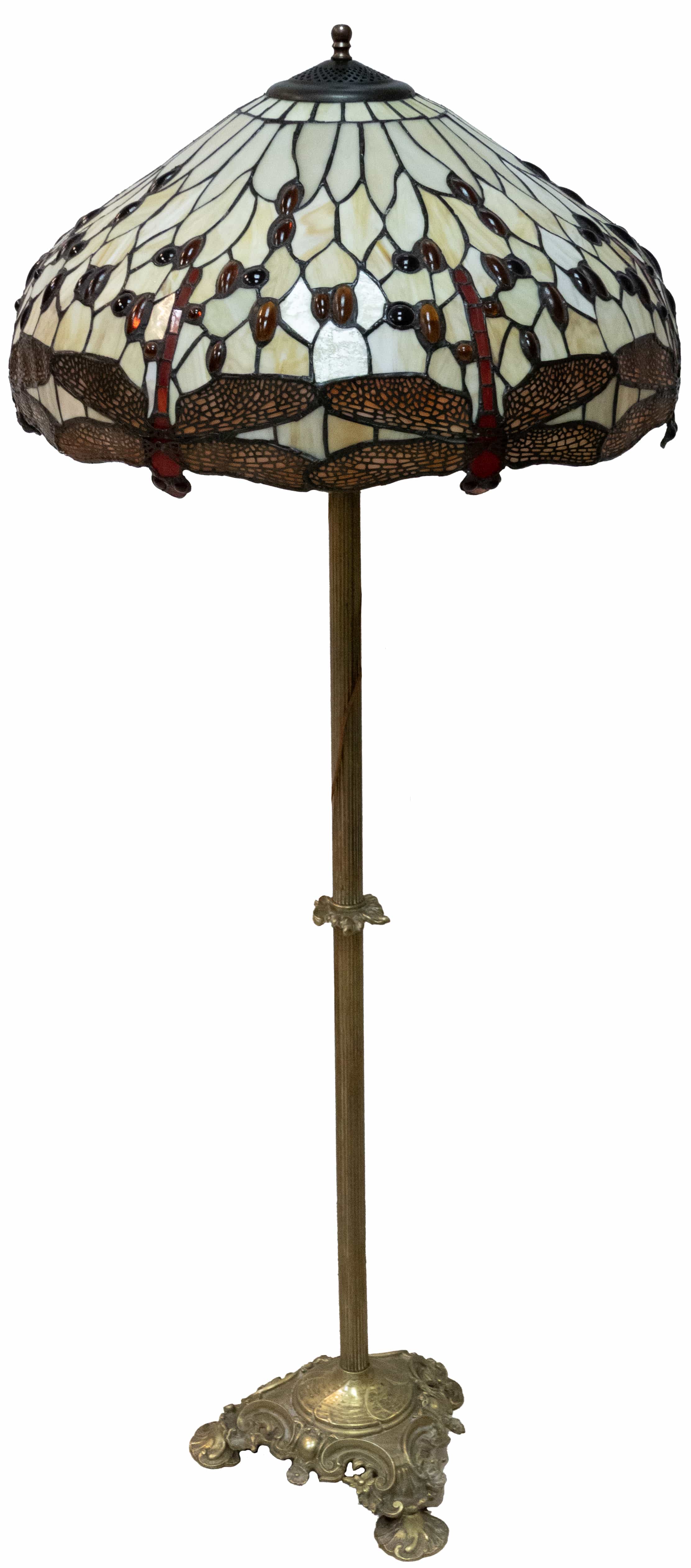 bronz și abajur din segmente de sticlă colorată, cabochoane de sticlă, H 130 cm, perioada interbelică