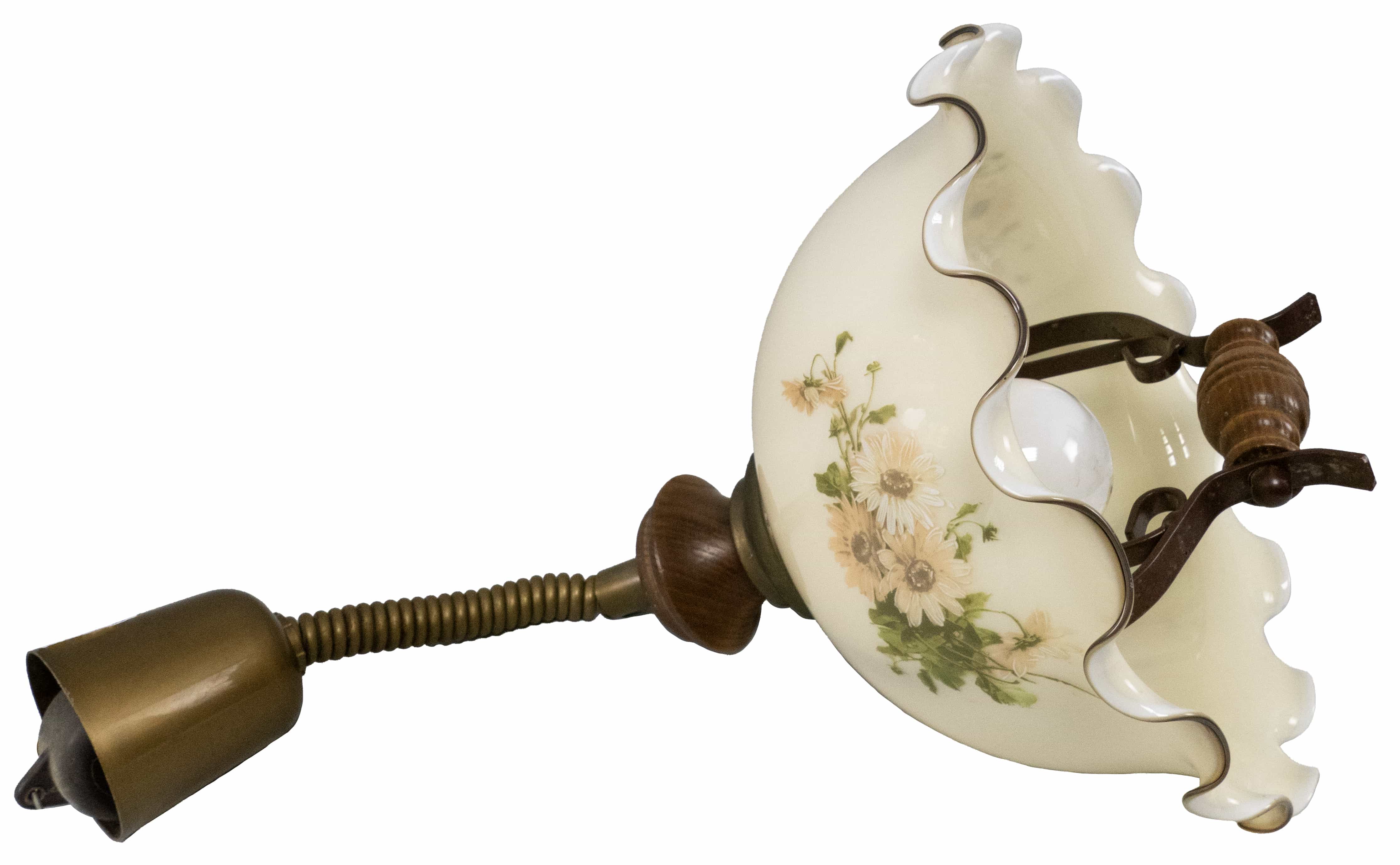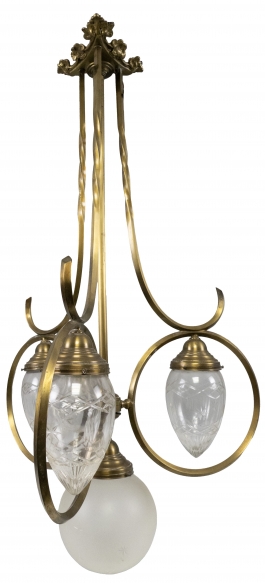 01.36 Lampă de plafon, trei brațe, glob central, bronz, alamă, cristal gravat, sticlă mătuită, L 83cm, perioada interbelică