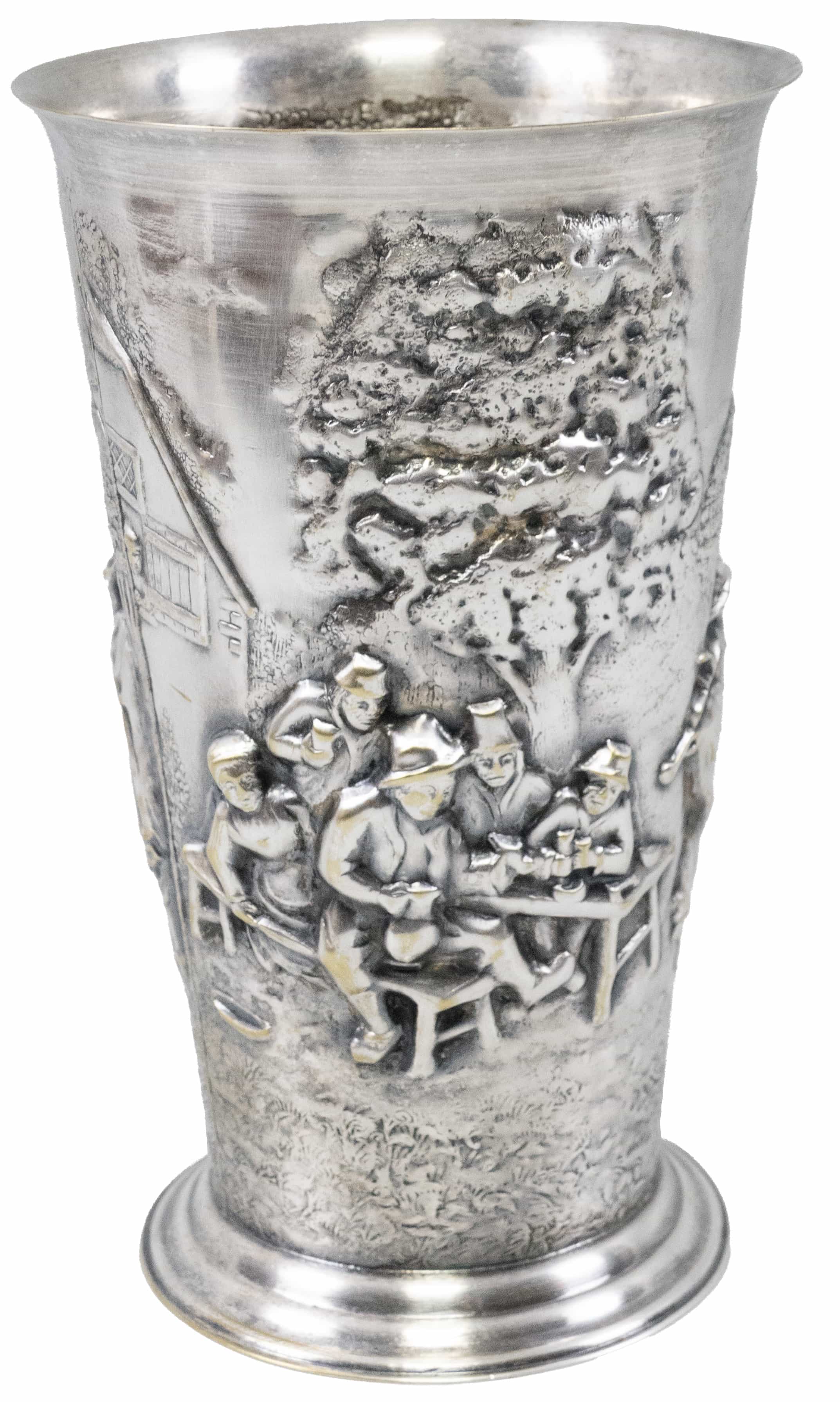 metal argintat, decorat în relief cu scenă de han, marcat Jorgen Th. Steffengen JTHS, H 16.5cm, Danemarca, perioada interbelică